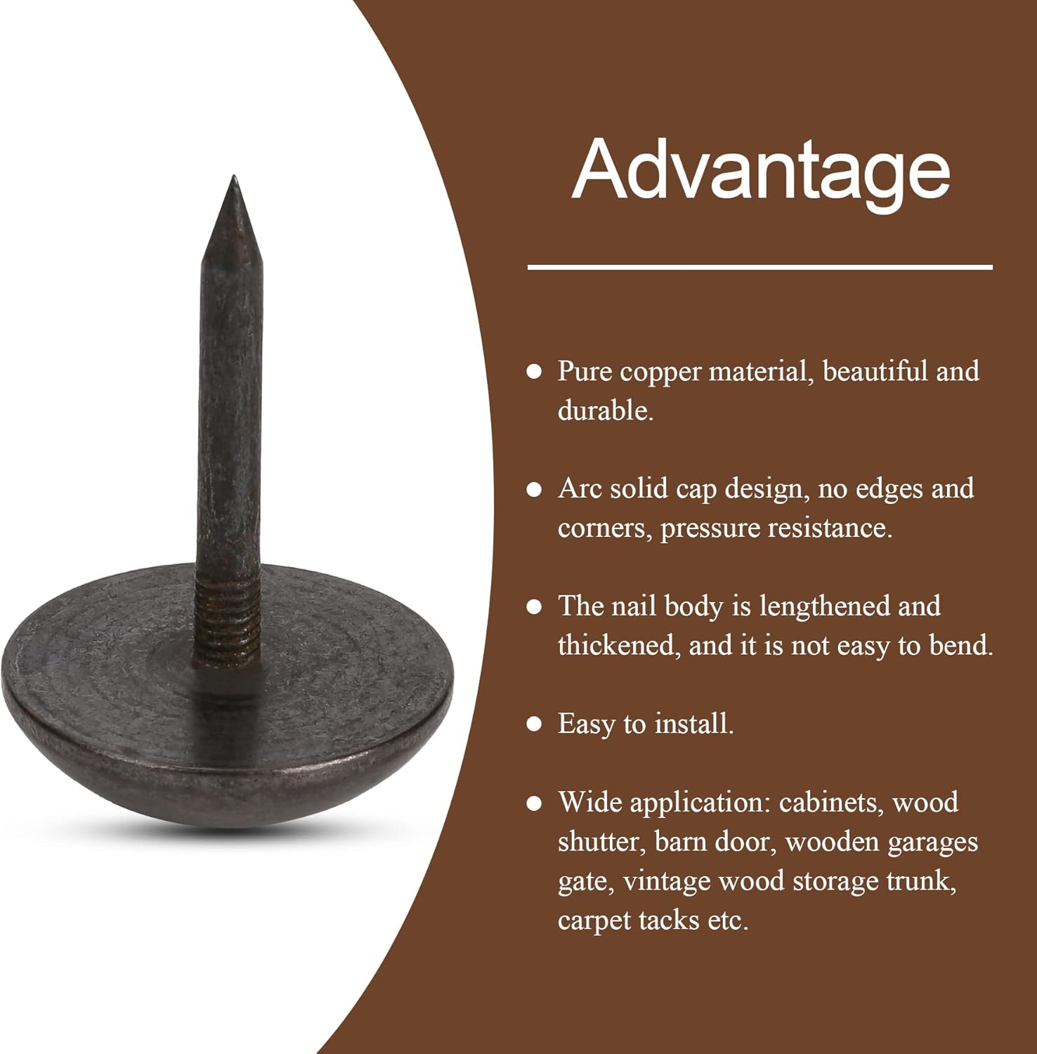 - 【Design】 The solid pure copper texture decorative nails is virtually maintenance free and is permanent.Cap nails body in thick design,will not break or bend for rustic wood furniture in your home or offices.