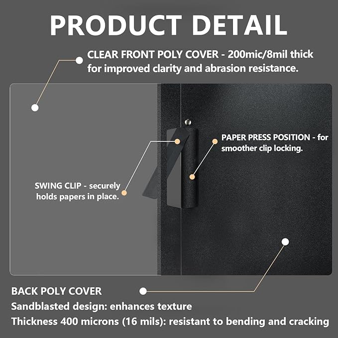 - Premium Clear & dent resistant folders: This file folder made with high-quality plastic. Crafted with 200-micron (8mil) optical-grade polypropylene front cover delivering crystal clarity β instantly reveal document titles for quick access. The 400-micron (16mil) reinforced back features a non-slip suede-textured finish that resists scratches, tears, and bending while providing protection.