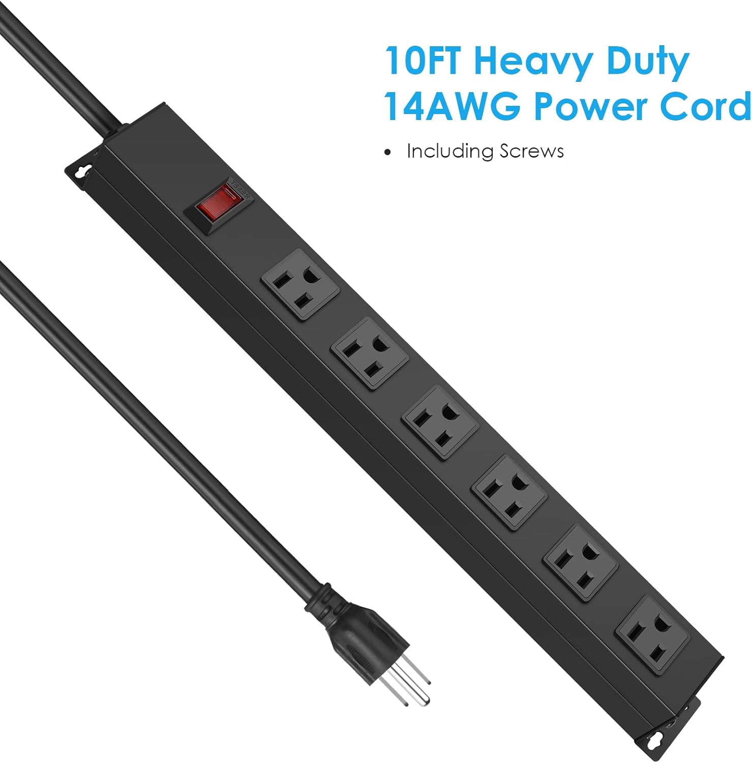 Metal Wall Mount Power Strip, Mountable Power Outlet with 6 AC Outlets, Aluminum Alloy Mount Power Socket with Switch, 10 FT SJT 3/C 14AWG Power Cord, 15A 125V 1875W (6AC) Black