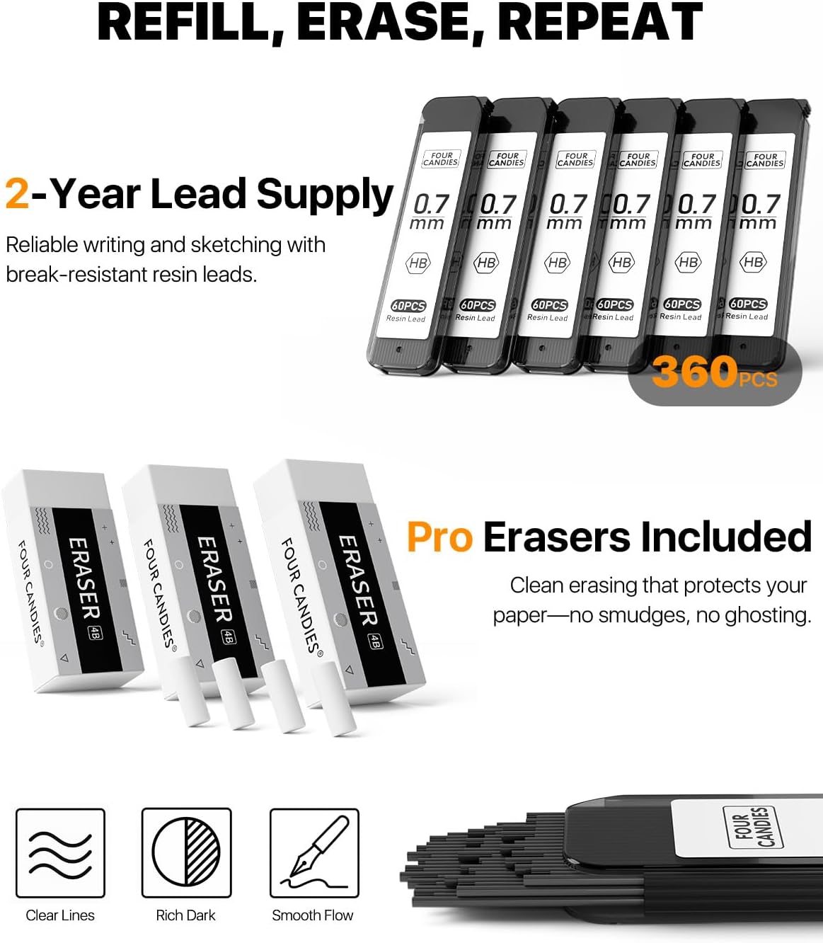 - Super Value Set: This set contains 3pcs 0.7mm drafting pencils and 360pcs HB Lead Refills, 3pcs 4B erasers, 9pcs eraser refills and a plastic storage case; This mechanical pencil set is great for writing, drawing, and sketching