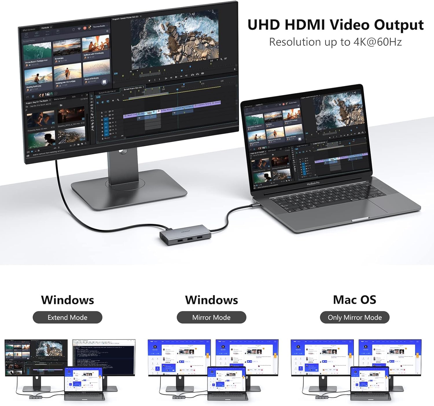 - Dual 4k Resolution Output: HDMI1/DP max up to 4K@60Hz, HDMI2 up to 4K@30Hz(work separately while source is DP1.4). When dual displays, HDMI1 or DP will be 4K@60Hz and HDMI2 up to 4K@59Hz(DP1.4). When using 2 hdmi+DP, HDMI1 up to 4K@59Hz, DP up to 4K@29Hz, HDMI2 up to 2K@60Hz(DP1.4).Display output will be 1080P when multiple monitor with VGA. Note!!! When using daul hdmi+DP, must follow the sequence or it will fail: Plug in HDMI1βPlug in DP(wait for the screen to display successfully)βPlug in HDMI2