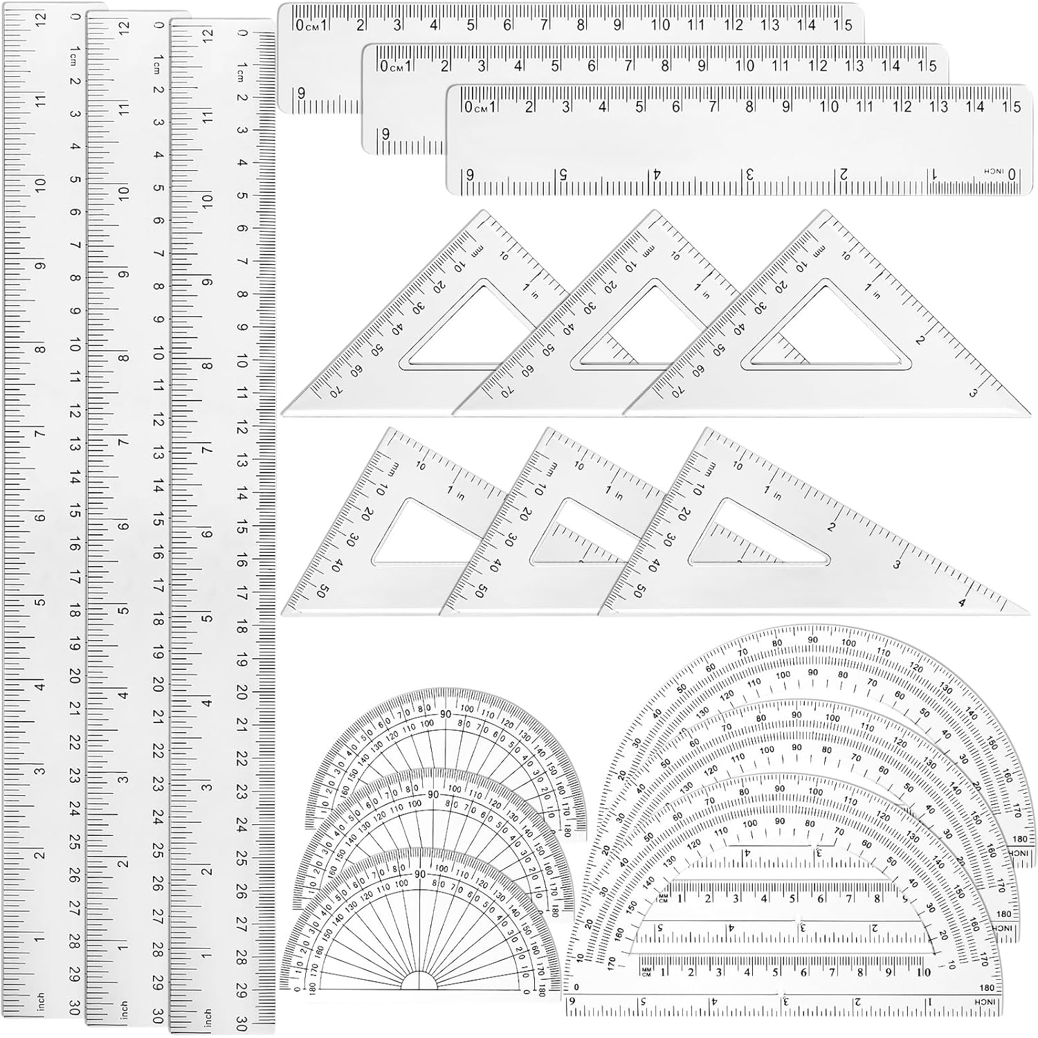 Tenare 18 Pcs Plastic Clear Math Set Includes Protractor Triangle Rulers 12 Inch 6 Inch Straight Geometry Math Transparent Ruler Measuring Tool for School Office Home Supplies