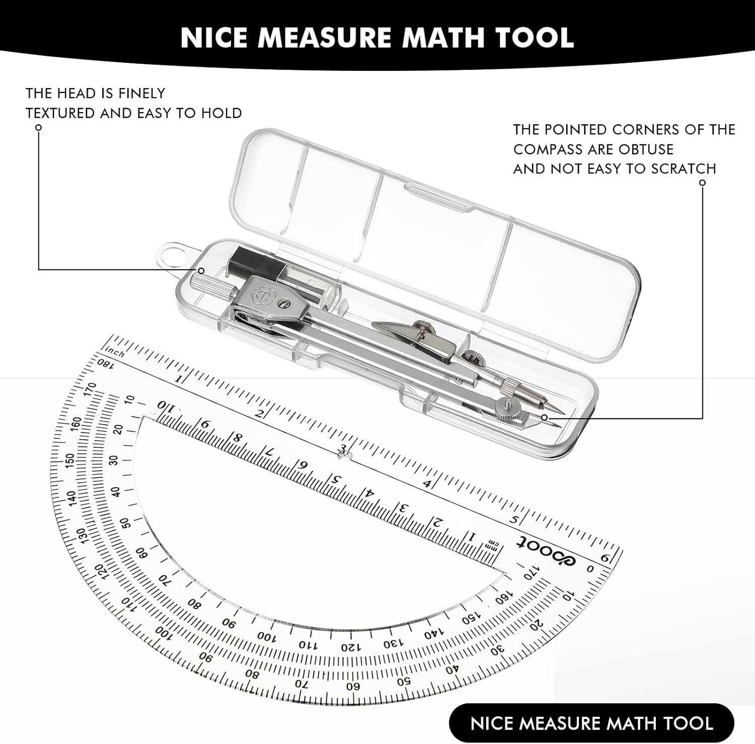- Strong Material: the math compass for geometry adopts nice technology, the gears of each component are tightly meshed and not easy to loosen, the metal pointed corners of the compass are obtuse and not easy to scratch, and the head of the compass is finely textured, which is easy to hold; The digit protractor is made of ABS plastic material, which has nice toughness and is not easy to break