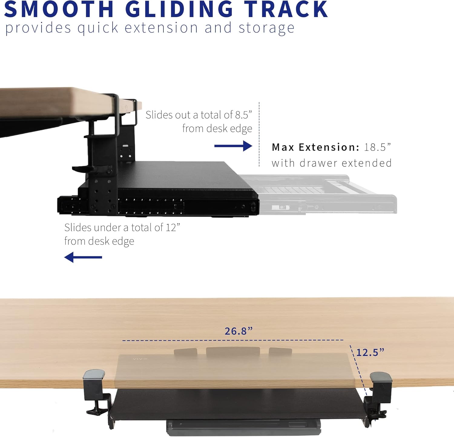 - Save Desk Space: This 26.8β (32.5β including clamps) x 11β under-desk keyboard tray holds your keyboard and mouse below the desktop for added work space. The 17β pencil drawer provides extra storage for small accessories