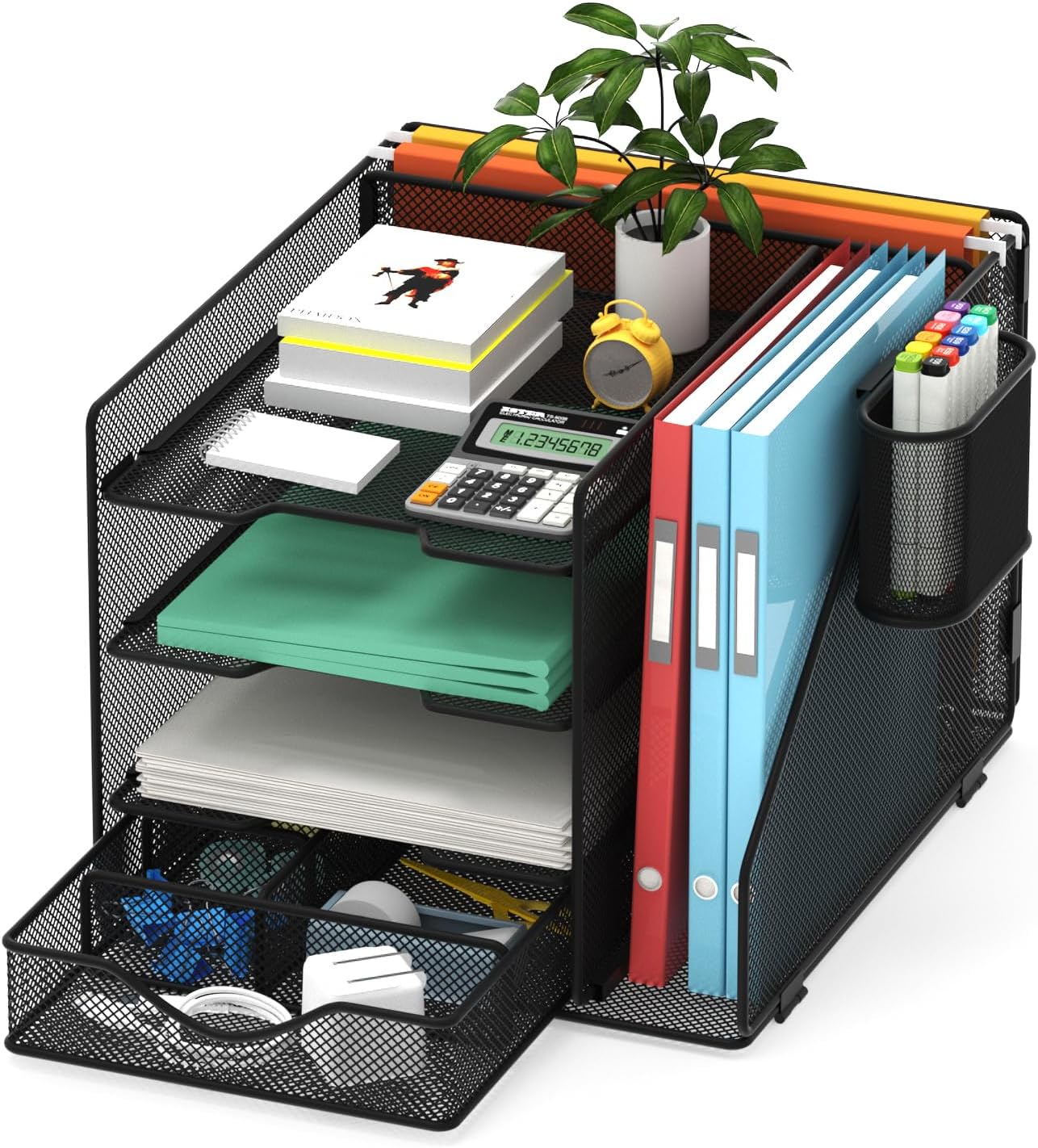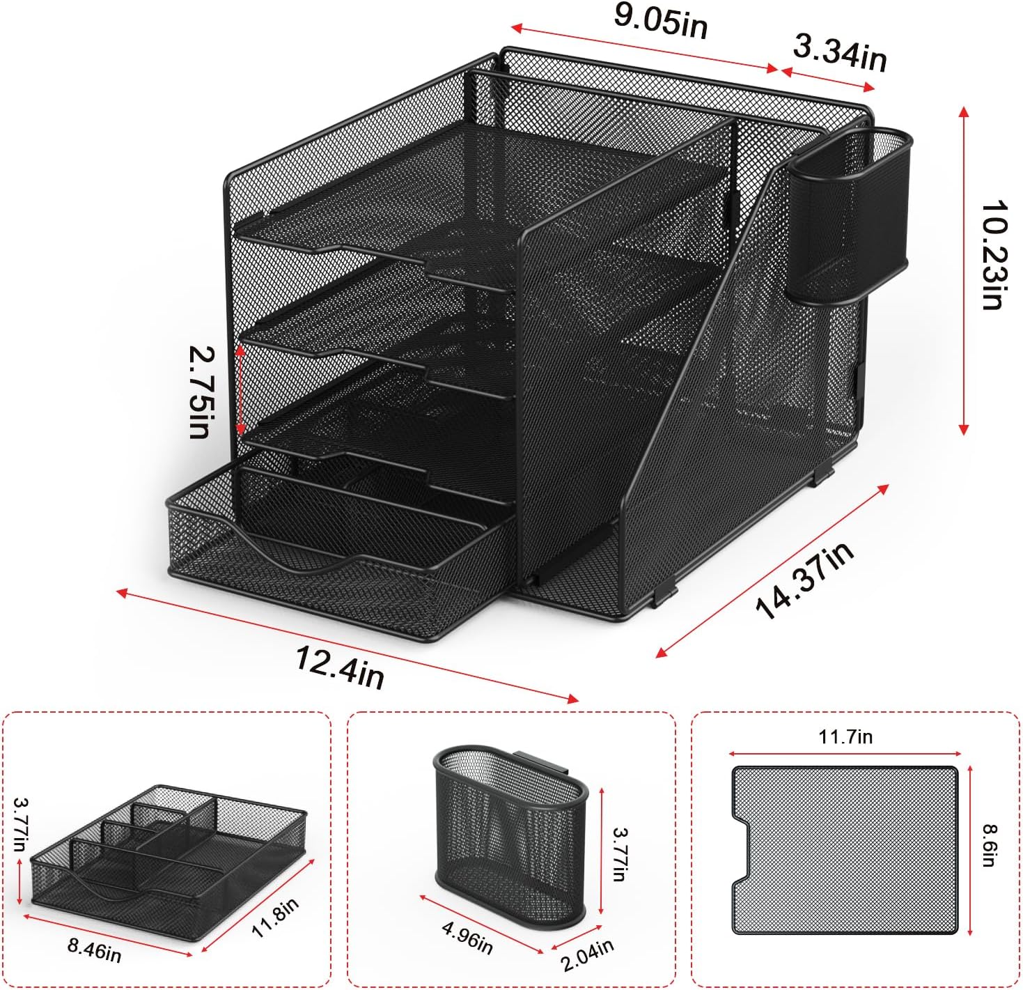 Desk Organizer with Hanging File Holder, Paper Letter Tray Organizer with Drawer and Pen Holder, Mesh Desktop Organizer and Storage for Office Supplies(Black)