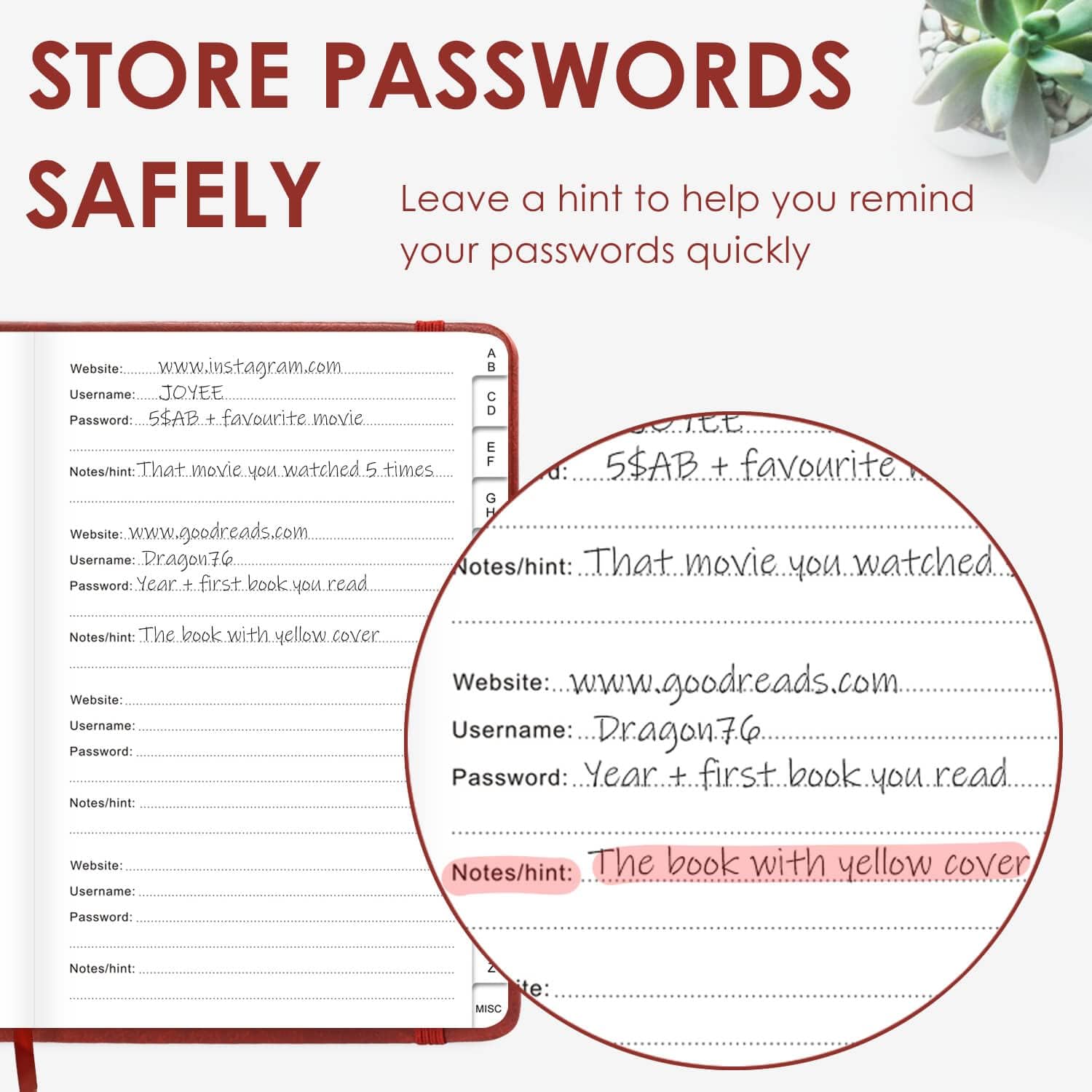 - NEVER FORGET A PASSWORD AGAIN: Almost every App. has a password, it is almost impossible to remember all the password log in details. This password book is specifically designed to help you create secure passwords and store all your passwords safely in one place. You will never forget your password log-in details again with this password keeper.