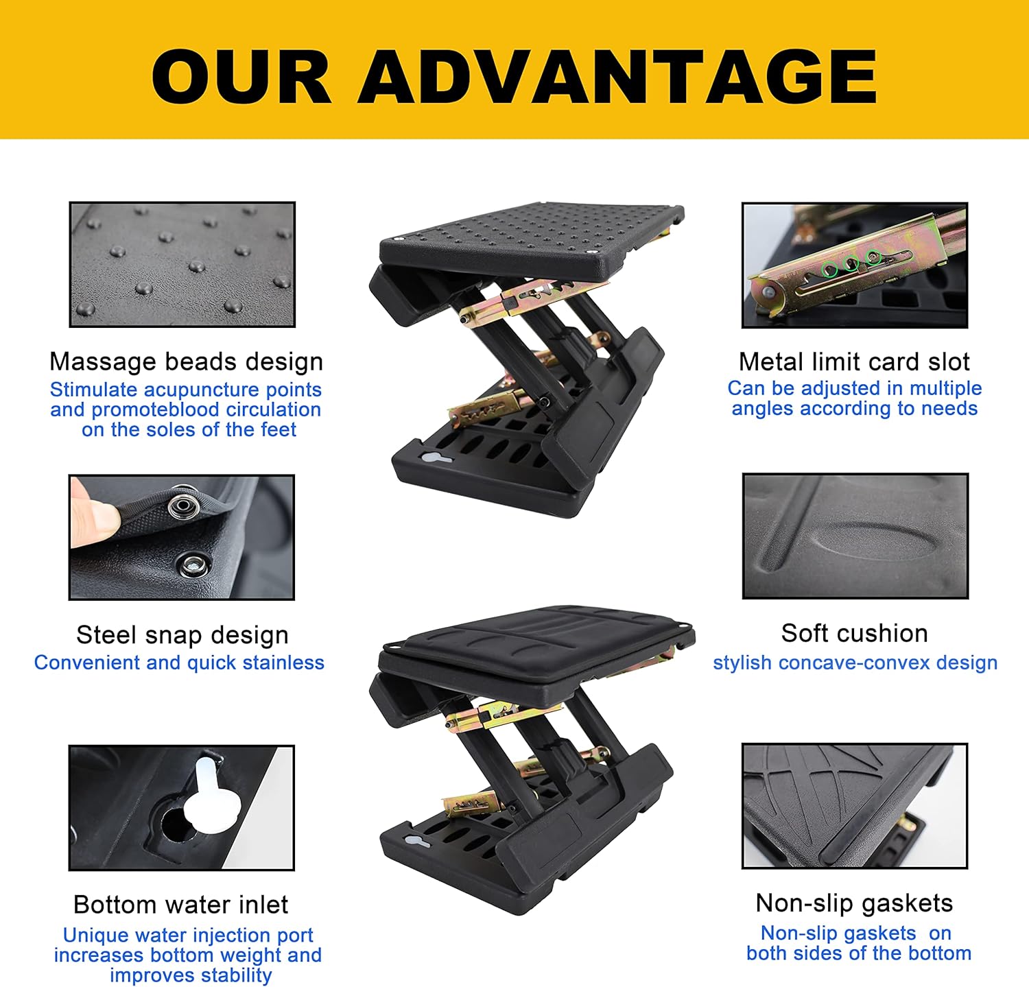 - [Special details]: Desk Foot Rest Ergonomic.There is a water injection port at the bottom of the product, (according to personal needs) when water is injected, it can increase the weight of the bottom and improve the stability of the product, the product can be folded into a mini size LxHxW 40×32×6cm/15.7"x12.6 "x2.36", lightweight at 5.9 lbs, easy to carry.