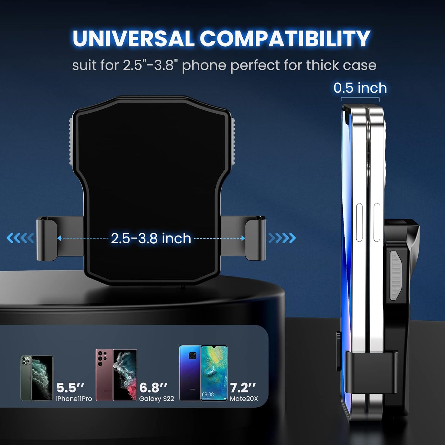 - Retractable Phone Clip, High Compatibility: The horizontal retractable clip perfectly solves the problem that the vertical retractable clip can't be adapted to the large phone size. Adapts to any screen size between 4.7"-7.2" phone, such as iPhone, Sumsung. Made of high-toughness aviation material, not easy to break. Designed with anti-slip silicone on the clip, the holder will not cause damage to your phone. The 0.5" depth of the holder will be suitable for most heavy phones and thick phone cases