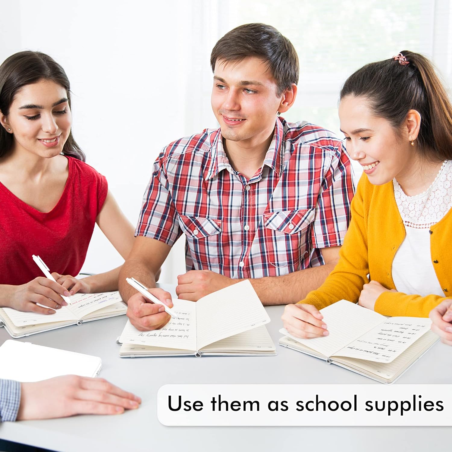 - Feela 5 Pack Classic Ruled Notebooks contains 5 white ruled sturdy cover notebooks and 5 Black Retractable Pens. Each of the notebooks measures 8.3” x 5.1”, which is perfect to carry and easily held by young girls and boys. These black cute pens are customized to be placed in the pen holder, which is pretty convenient.