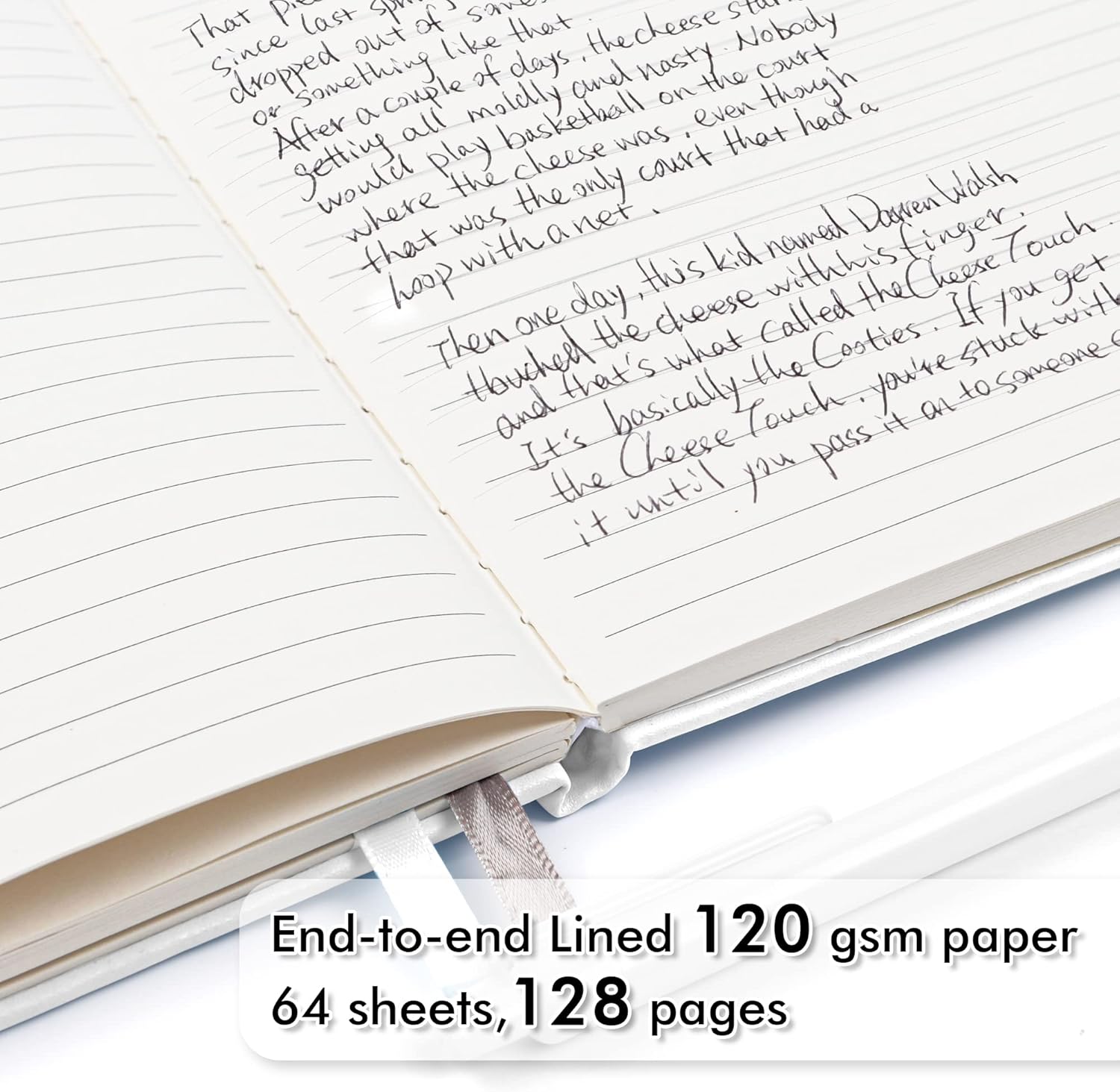 feela 5 Pack Notebooks Journals Bulk, Hardcover Notebook Classic Ruled Lined Journals with Pen Holder for Women Girls School Business Supplies, with 5 Black Pens, 120 GSM, 5.1”x8.3”, A5, White
