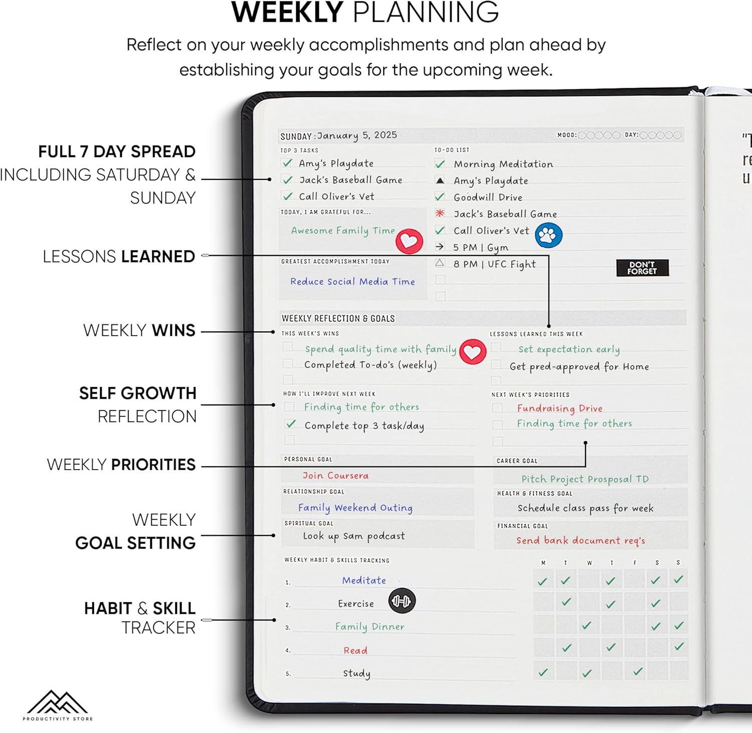 - Undated Weekly Planner with Planner Stickers & Other Bonuses: Use the weekly planner sections to plan ahead each week and reflecting on your weekly performance. This 2025 weekly planner also comes with 5 Bonus features including planner stickers, a habit tracker, weekly inspirational quotes and space for notes.