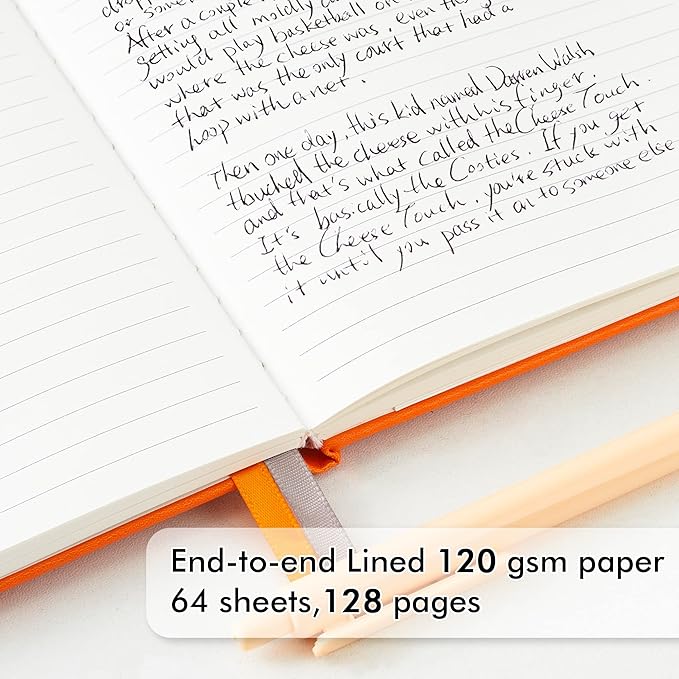 - These classic ruled notebooks are all blank inside with 128 lined pages (64 sheets), which would be convenient for daily usage. The hard cover journal has a water-resistant faux leather cover, round corners and bookmarks, which is designed to lay and open flat. There’s a “date/page” column on the top of every page. You can use it as a reminder to let you remember those important dates and find the page you want in a very short time.