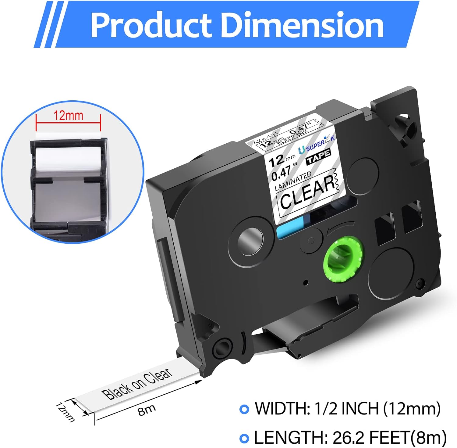 - Color: Black Text on Clear Background, Length: 8m(26.2 feet), Width:12mm (1/2 inch or 0.47'')