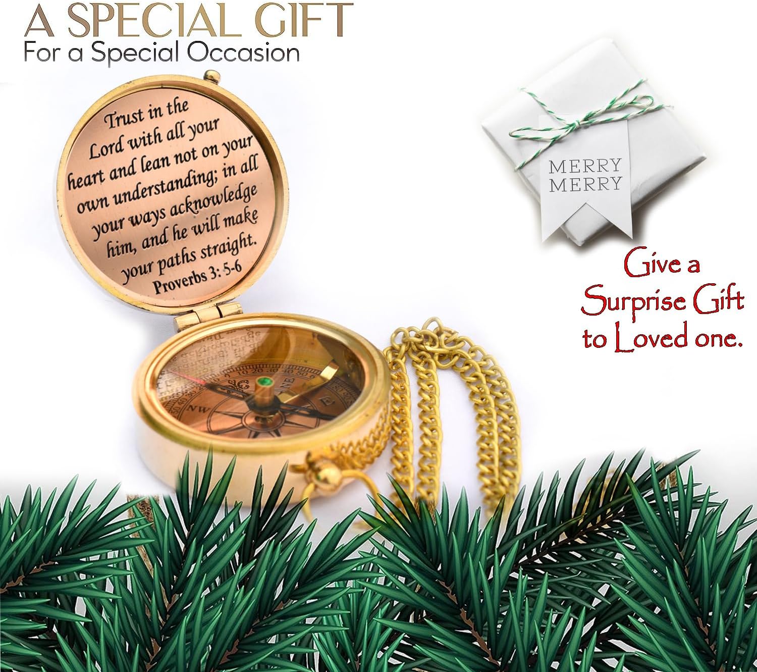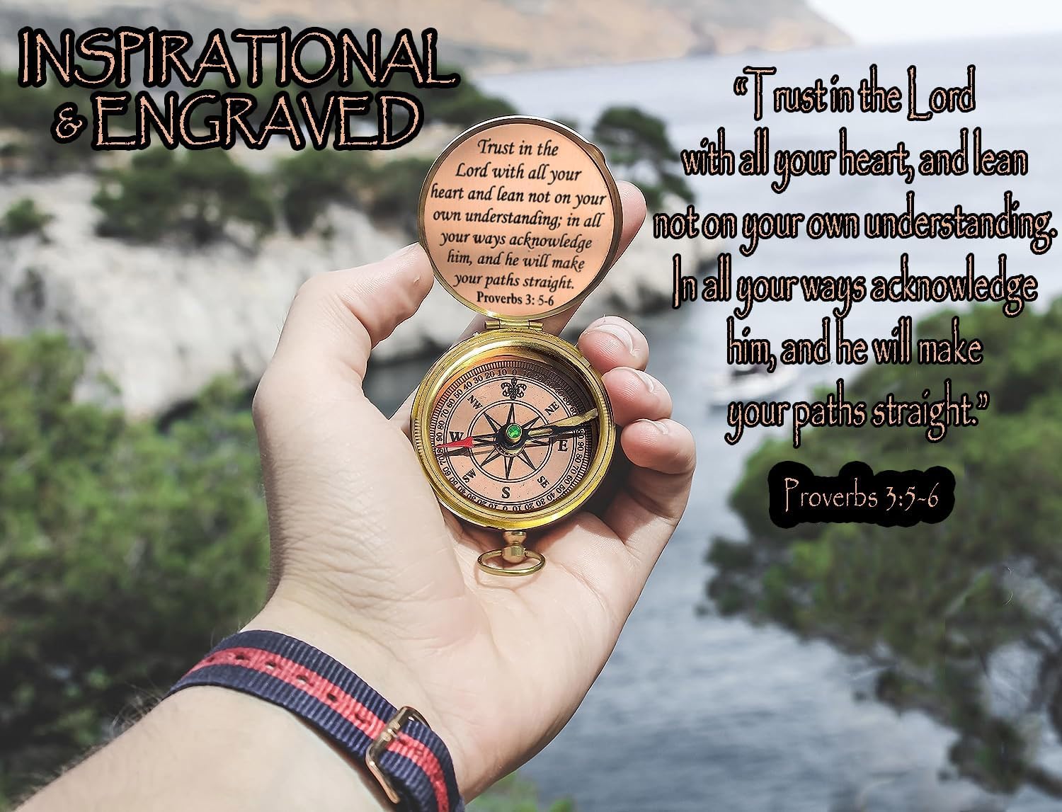 - Solid Brass Compass Antiquated Brass Finish With Trust in The Lord with All Your Heart -Proverbs 3: 5-6 Quote Engraved Compass with Wooden Box