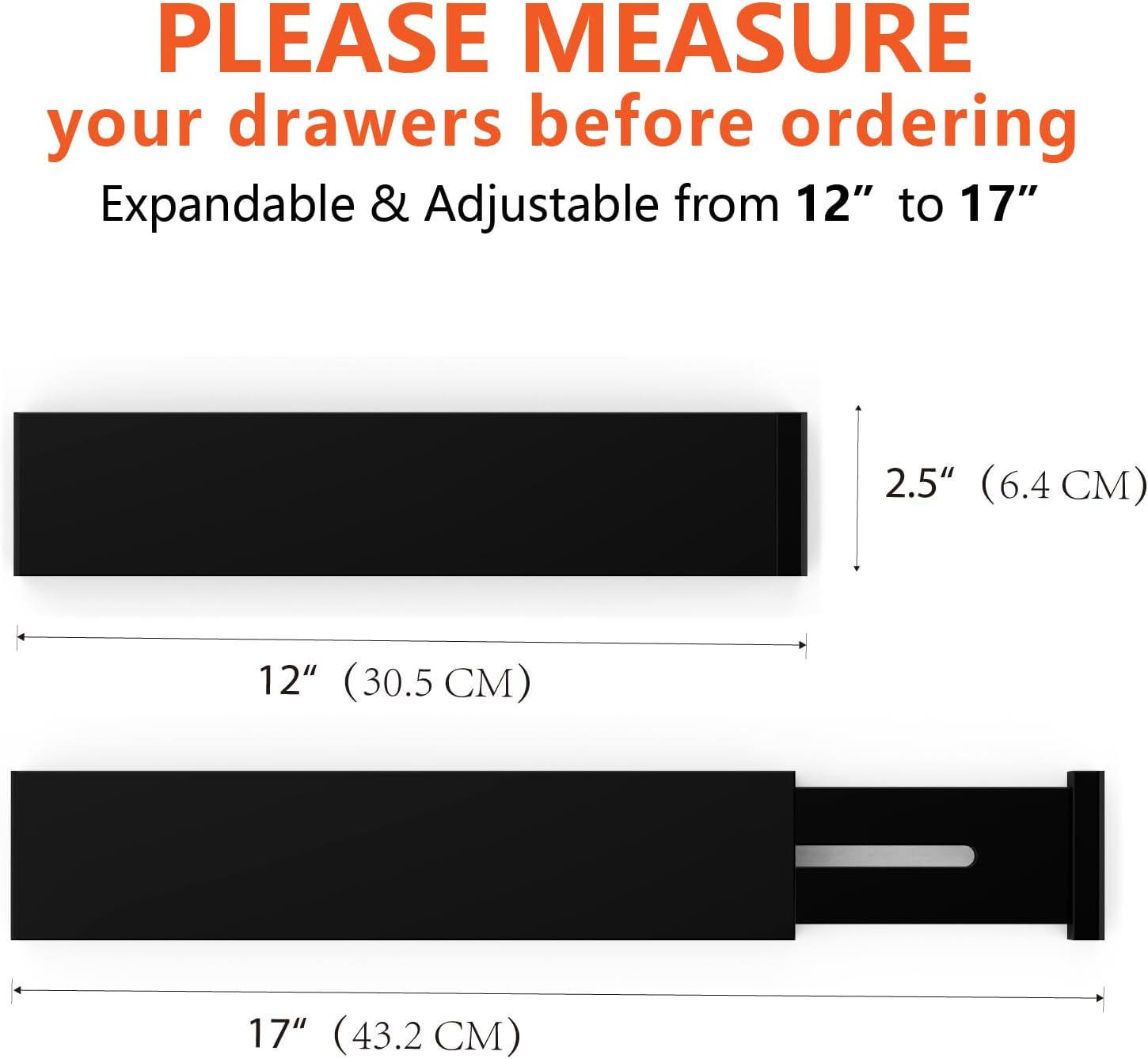 - EXPANDABLE AND ADJUSTABLE DESIGN: The drawer organizer set comes with four expandable drawer divider pieces, and each drawer divider is 2.5" tall, 0.6" thick and expandable from 12" to 17" in full length; so that you can rearrange to your desired structure, our drawer separators are adjustable to fit large spacious kitchen drawers and even your shortest and most narrow office drawers. So you can take full advantage, be sure to measure your drawers prior to purchase as our expandable drawer organizer set