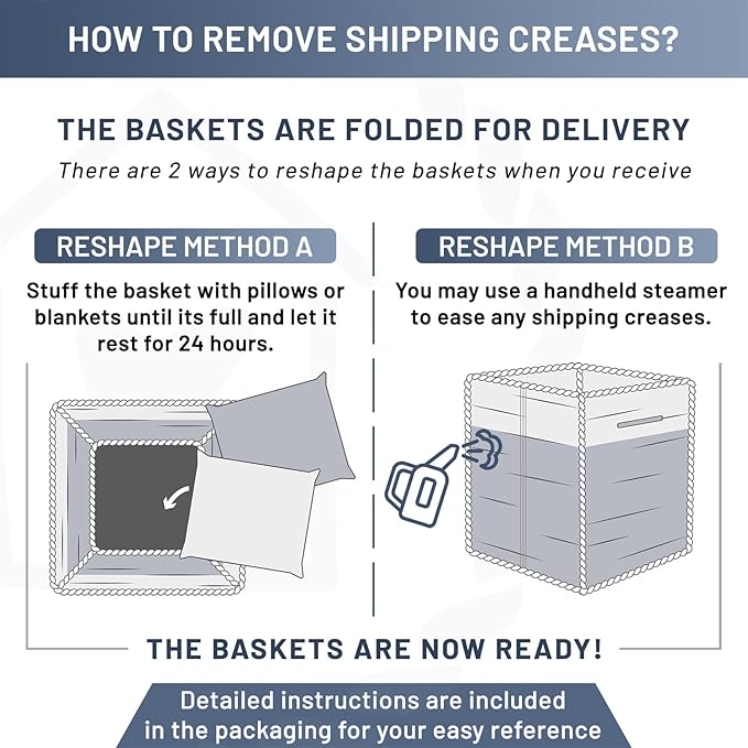 - No More Wrinkly Floppy Woven Baskets: Prepare to have your socks knocked off (and then neatly organized), when you take a peek at our woven rope basket set. No more ‘permanently’ creased up, floppy storage basket here. Thanks to our unique folding method and quality rope, shaping is easy with the instructions provided!