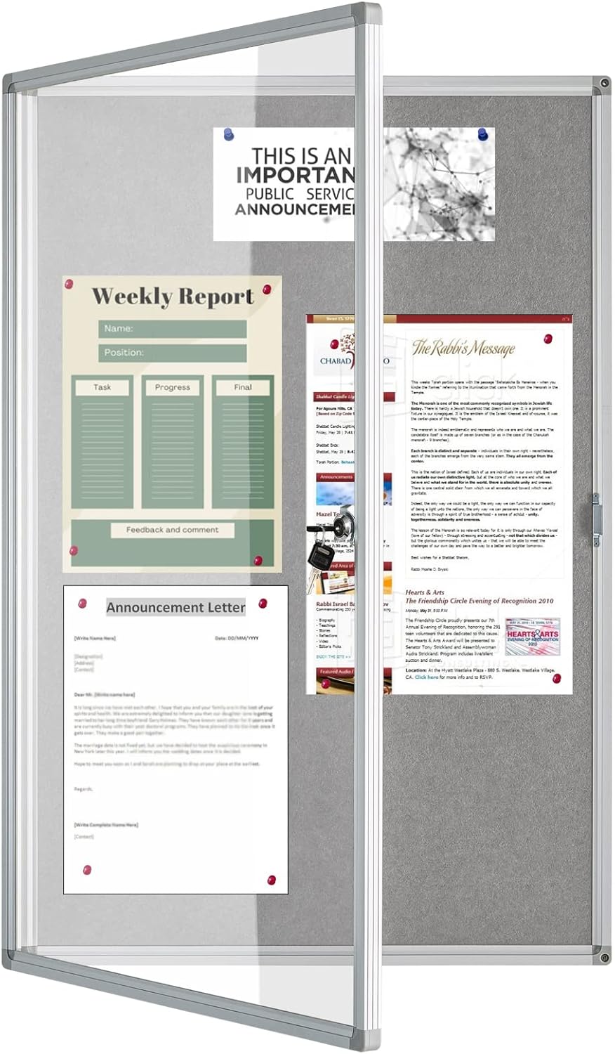 - Enclosed bulletin board with locking door safeguards documents from dust, moisture, and vandalism in high-traffic areas. Dual-key operated locks prevent unauthorized access, ideal for schools, offices, or government facilities.