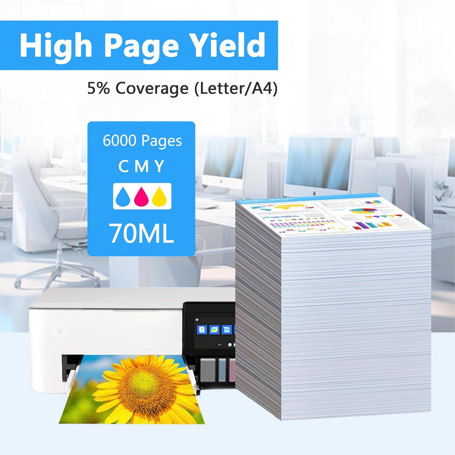 - High Capacity: Extra-large capacity ink bottle, longer replacement interval. Includes 3 Ink Bottles: Up to 6000 pages per T542 Cyan/Magenta/Yellow ink bottle in 70ml (with 5% Coverage of A4 paper).