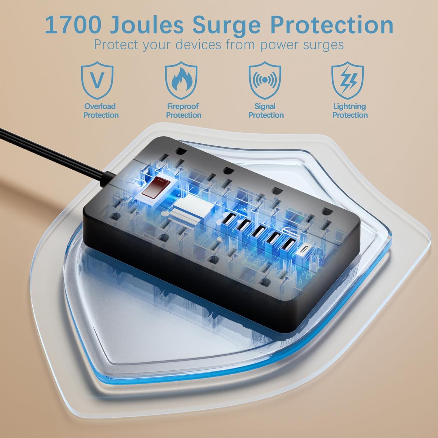 - Power strip with 6 USB: 6 USB ports detect your devices automaticlly and charge in the fastest speed; The USB port provide 5V/2.4A max while using one port, 5V/3.4A 17W total; No need a variety of converters, Compatible with phones, tablets, and other electronic appliances