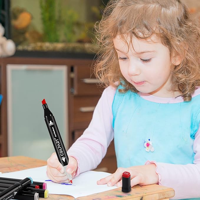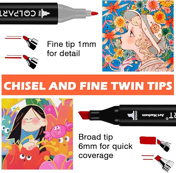 - 【Dual Tips Art Markers】Dual tips art markers design allows you to make thick and thin lines without changing alcohol markers.Includes Fine tip 1mm and Broad tip 6mm two tips for precise highlighting, sketching and underlining. Thin markers can be used to write and hook line while thick art markers professional are suitable for drawing and coloring.