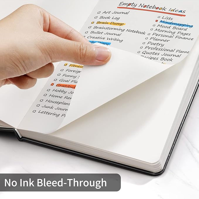 - Multifunctional Cover: The hard cover is made of vegan leather, and designed with a pen loop, an elastic band, two ribbon page markers, an expandable inner pocket.