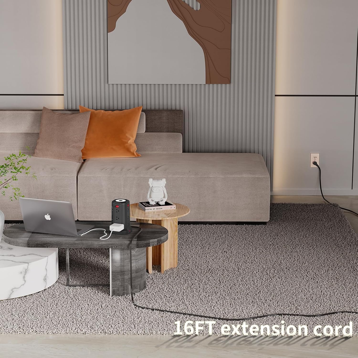 - 16 Feet Extra Long Extension Cord: This multiple outlets charging tower power strip has a 45Β° flat plug and 16 ft long cord. The long extension cord cable is flexible enough that can fit easily into hard-to-reach places behind your bed or sofa in a long distance.