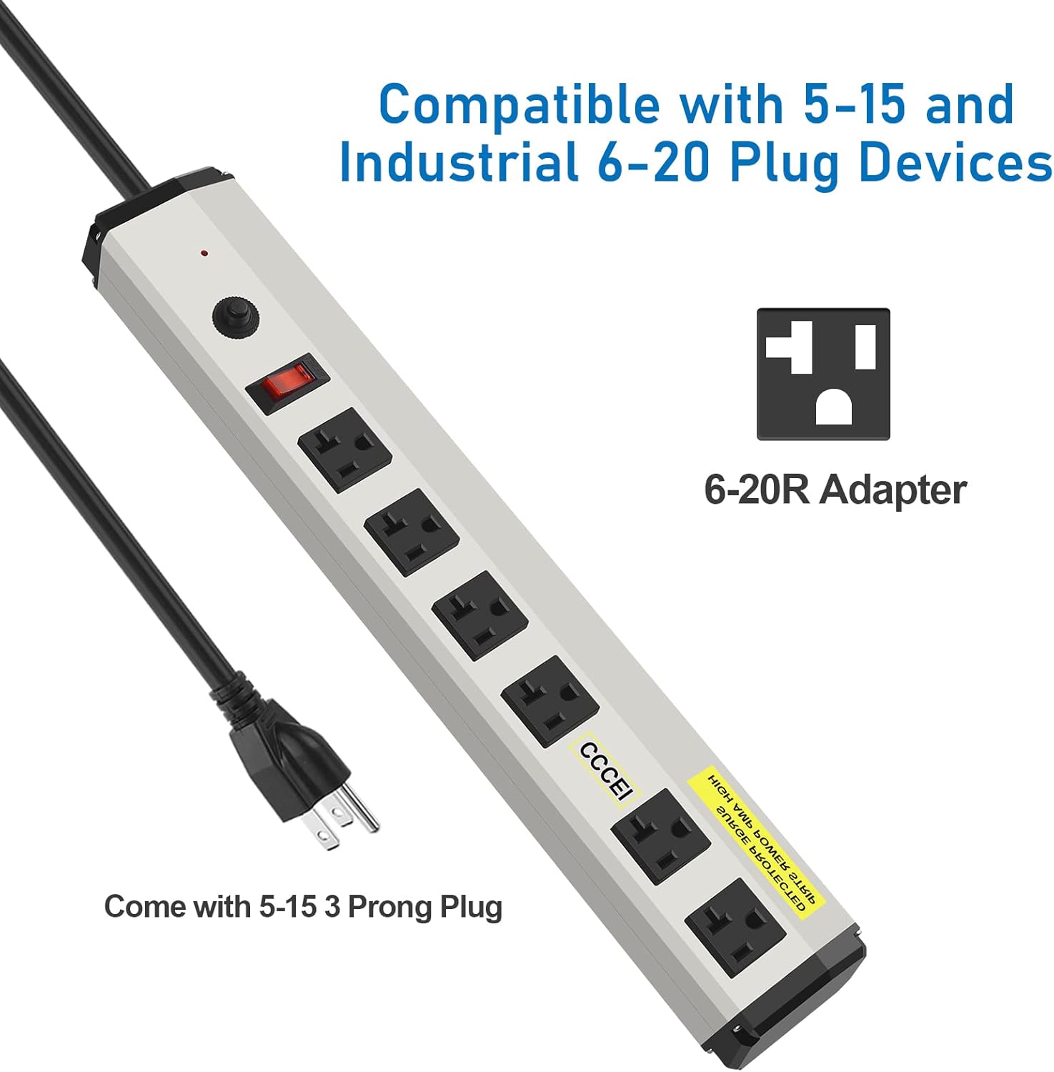 CCCEI Heavy Duty Power Strip Surge Protector 20 Amp, High Amp Industrial Shop Garage Metal Multiple Outlets, 6 FT 12 Gauge 5-15P Extension Cord 6 Outlet 6-20R T-Slot 20a for Appliance.
