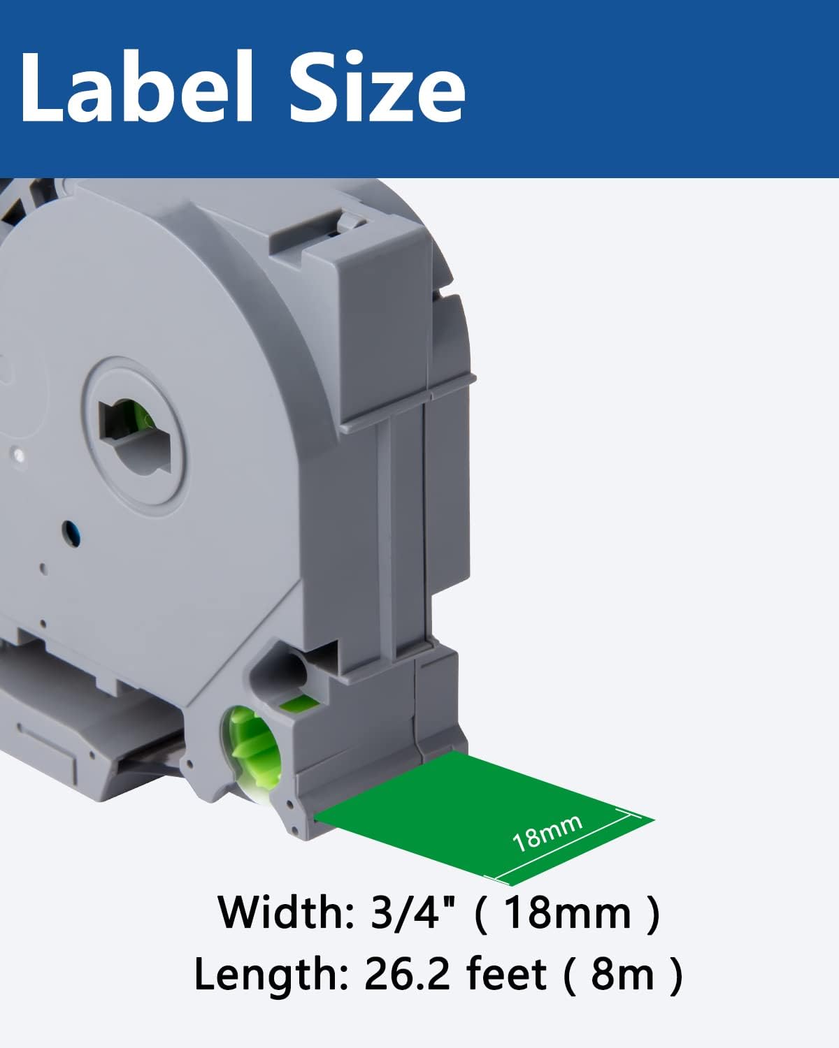 - Size - 3/4" width x 26.2' length ( 18mm x 8m ) each 18mm label maker tape. Color - Black ink on green tape