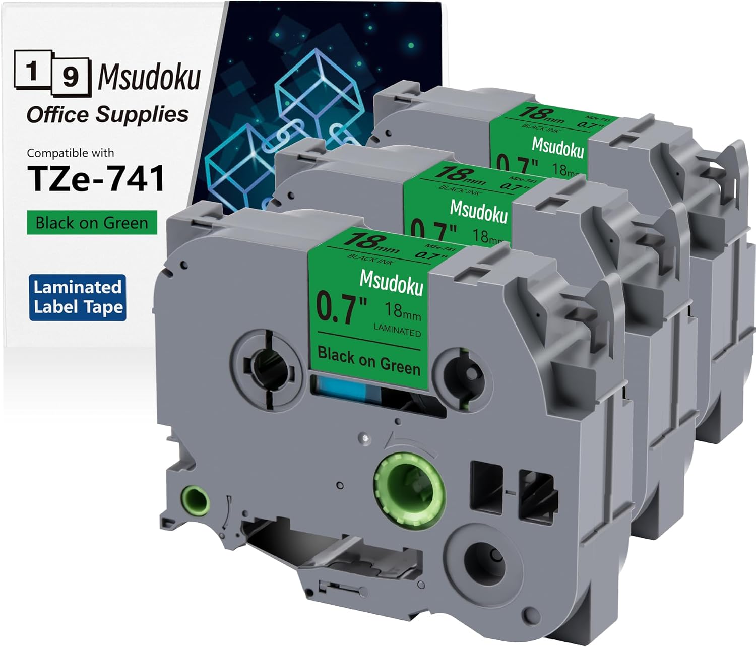 - These compatible for brother label maker tape 18mm 0.7 TZe-741 TZe741 have strong adhesive and no sticky residue when you remove it. The split back design of ptouch label tape 18mm green tape is very easy to peel off