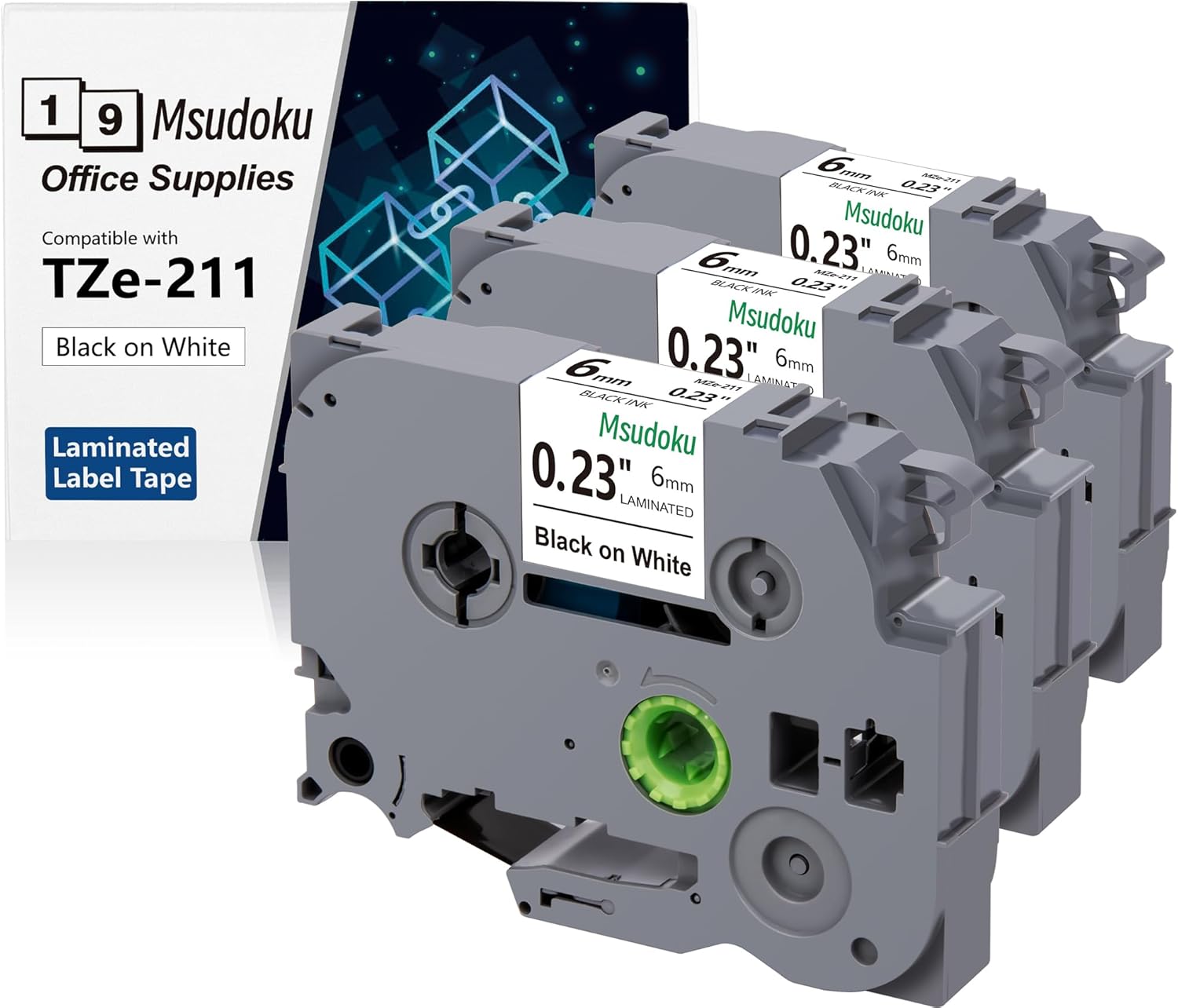 - These compatible for brother label maker tape 6mm 0.23 TZe-211 TZe211 have strong adhesive and no sticky residue when you remove it. The split back design of ptouch label tape 6mm white tape is very easy to peel off