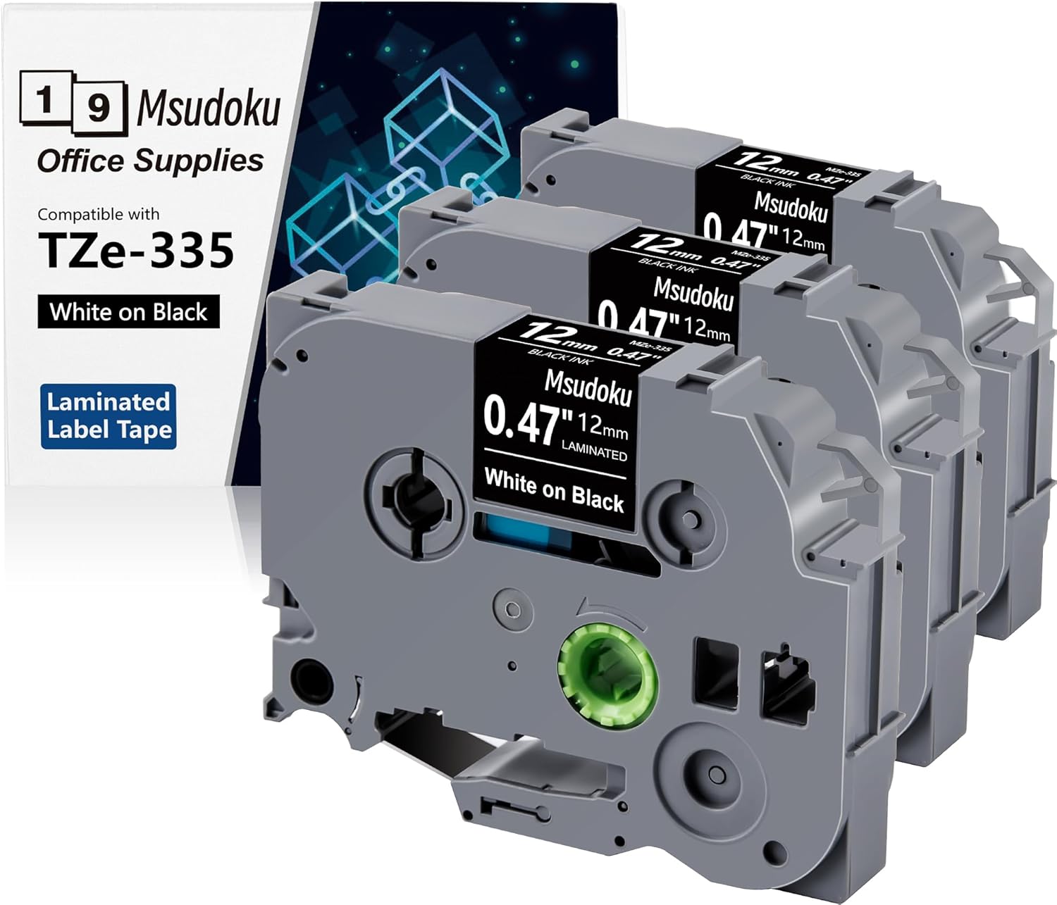 - These compatible for brother label maker tape 12mm 0.47 TZe-335 TZe335 have strong adhesive and no sticky residue when you remove it. The split back design of ptouch label tape 12mm black tape is very easy to peel off