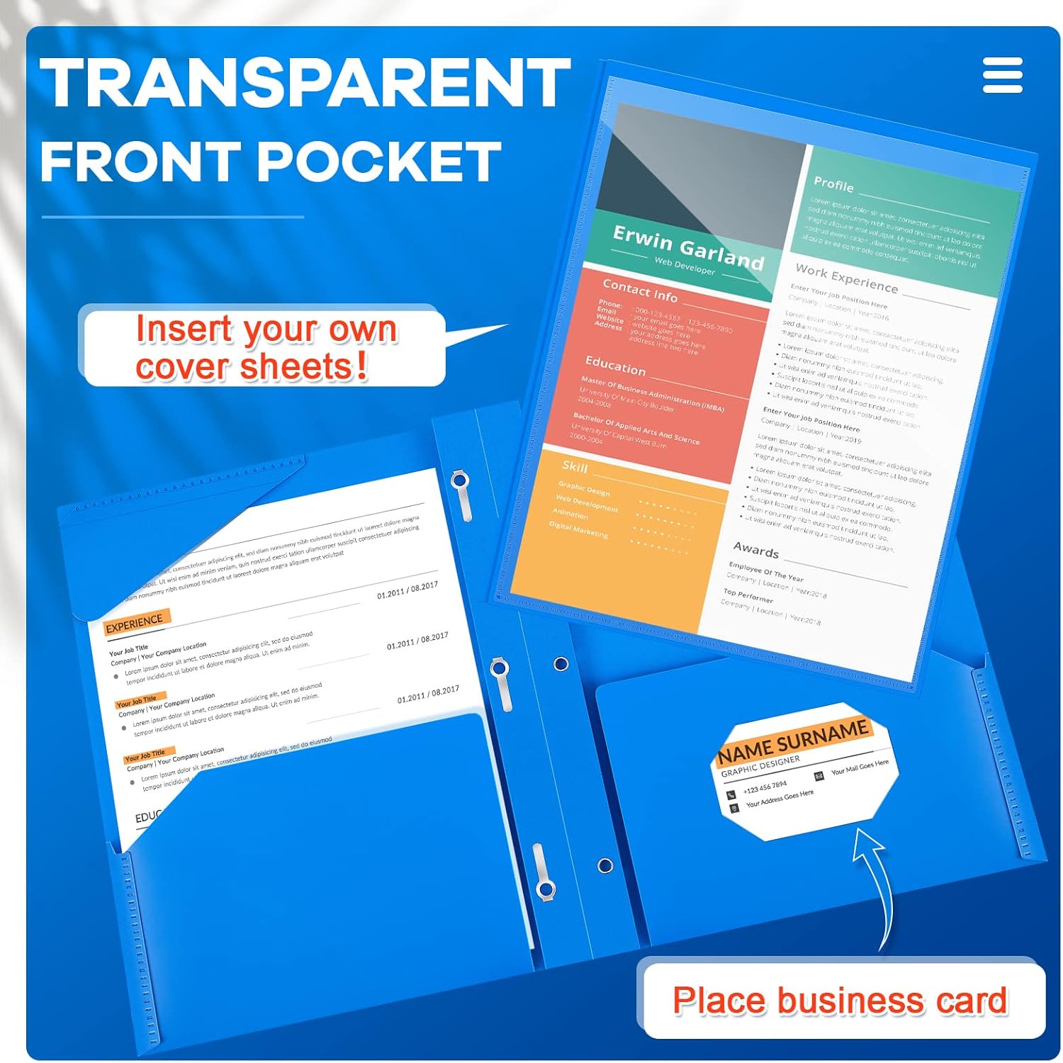 - Practical and Useful: with a clear front pocket, you can put your catalog, tables, favorite reports, presentations and more for clear display; Each plastic folder has 2 internal pockets to help organize and store your letter sized paper and documents; There are also 3 prongs to secure your 3-hole loose leaf paper in case it falls, and the card slot can hold your ID card or business card, practical for your daily work
