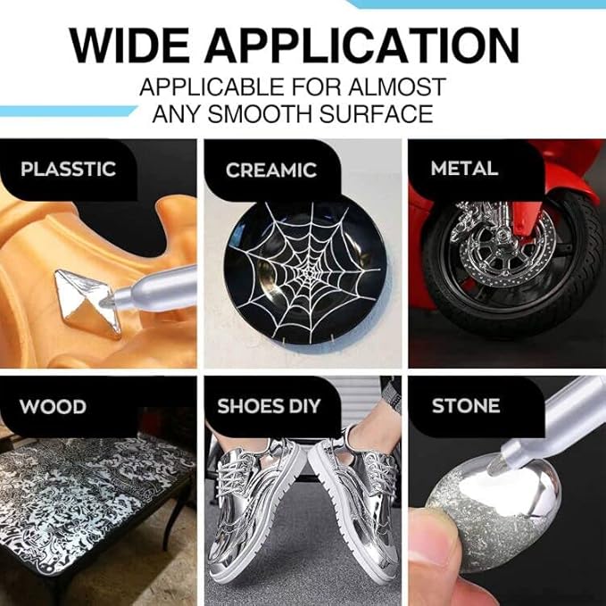 - Great for Most Surfaces.: These silver metallic permanent markers work well on most surfaces, such as paper, wood, enamel, chalkboards, canvas, wood, brick, stone, glass, mirrors, windows, metal, plastic, ceramic, fabric, etc. Decorate your clothes, gift bags, shoes, and personalize coasters, coffee mugs, journals and other crafts.