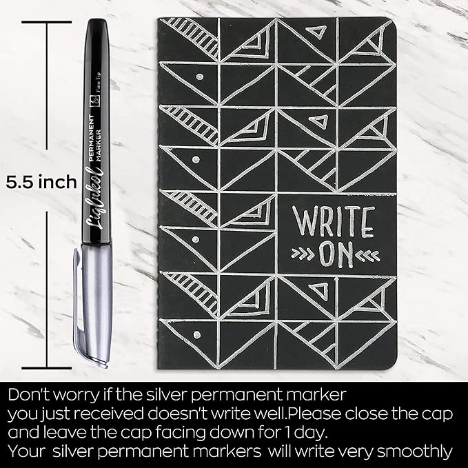 - Clever Design: Fine point for smooth writing. You can meet diversified applications. The barrel of silver metallic permanent marker is long and round, which is convenient to hold and comfortable grip. Covering the cap can prevent the ink from drying when not use. Ink coverage is consistent.
