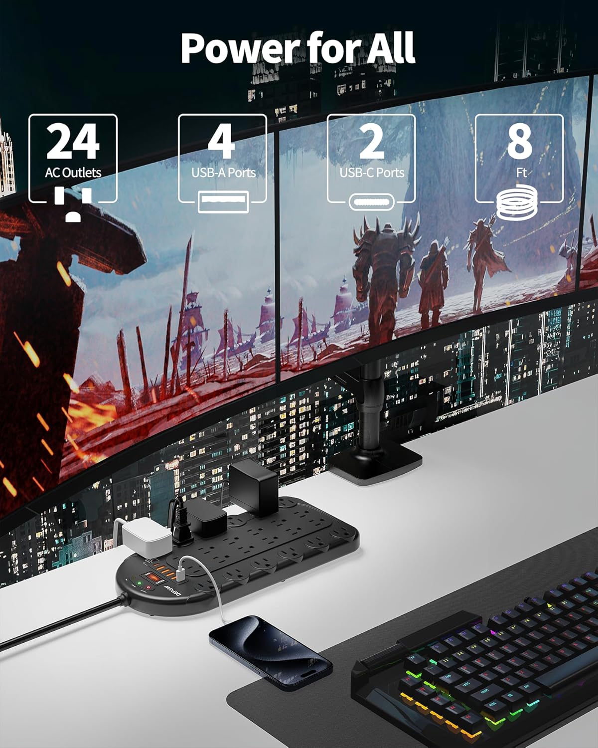 Power Strip, 24 AC Outlets (1875W/15A) with 6 USBs (2 USB-C Ports), ETL Listed, Surge Protector (3,400 Joules), 8 Ft Heavy Duty Flat Plug Extension Cord, Wall Mountable for Home, Office, Black