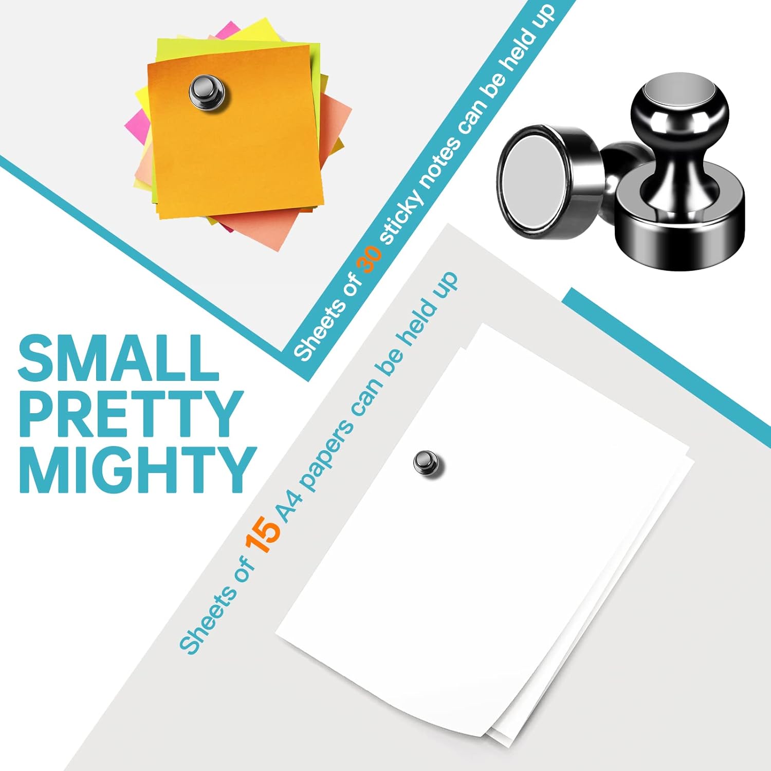 - 🌈【POWERFUL MAGNETS】Small, but mighty! Sheets of 15 A4 paper or 30 sticky notes can be held up onto metal surfaces.No sliding or annoying drops. Much better than the cheap plastic ones. Push pin magnets look sleek and professional!