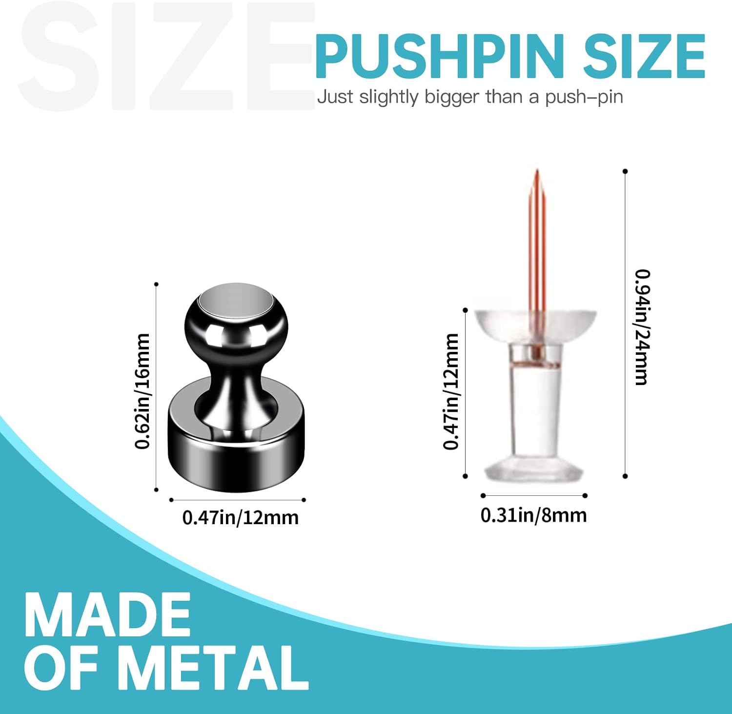 - 🌈【PUSHPIN SIZE】The size of board magnets is 0.47in/12mm x 0.62in/16mm, just slightly bigger than a push-pin, magnets for office are small enough so they don't obscure the ornaments you hang up. Heavy duty magnetic pins have a small handle design for ease to grip and removal. Also does not leave scratch marks behind.