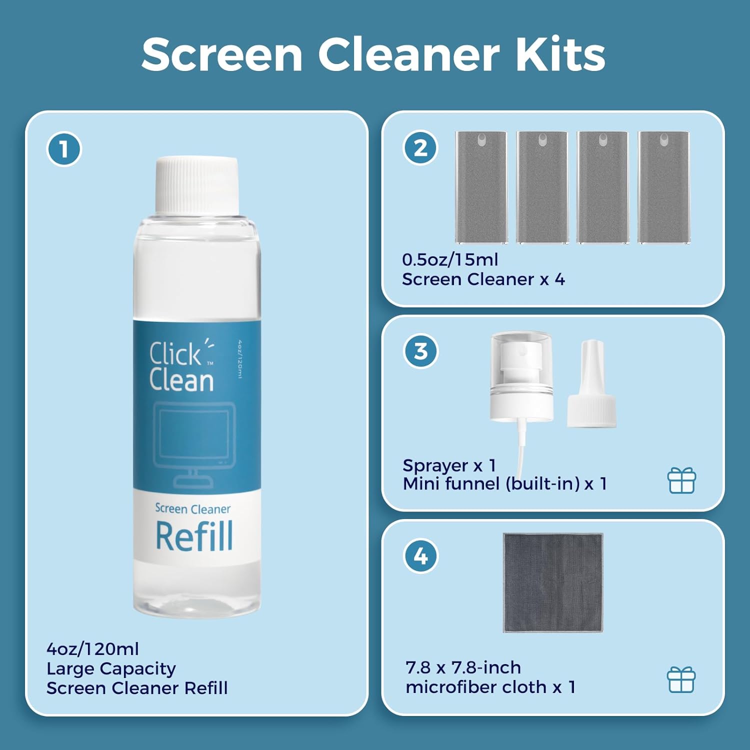 Click Clean Screen Cleaner Kits - 4 All-in-One Mist Cleaner with 4 oz Refill, 1 Microfiber Cloth(7.8 x 7.8in), 1 Mini Funnel, and 1 Sprayer - for All Phones, Laptop and Tablet Screens