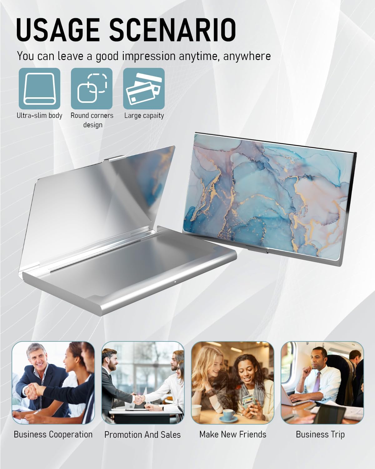 - 【Lightweight & Portable】Store at least 13 standard business cards.The small metal business card holder measures is 3.7 x 2.4 x 0.16 Inches,slides easily in your front pocket and purses.Slim business card wallet is convenient for you to use, carry, and store.