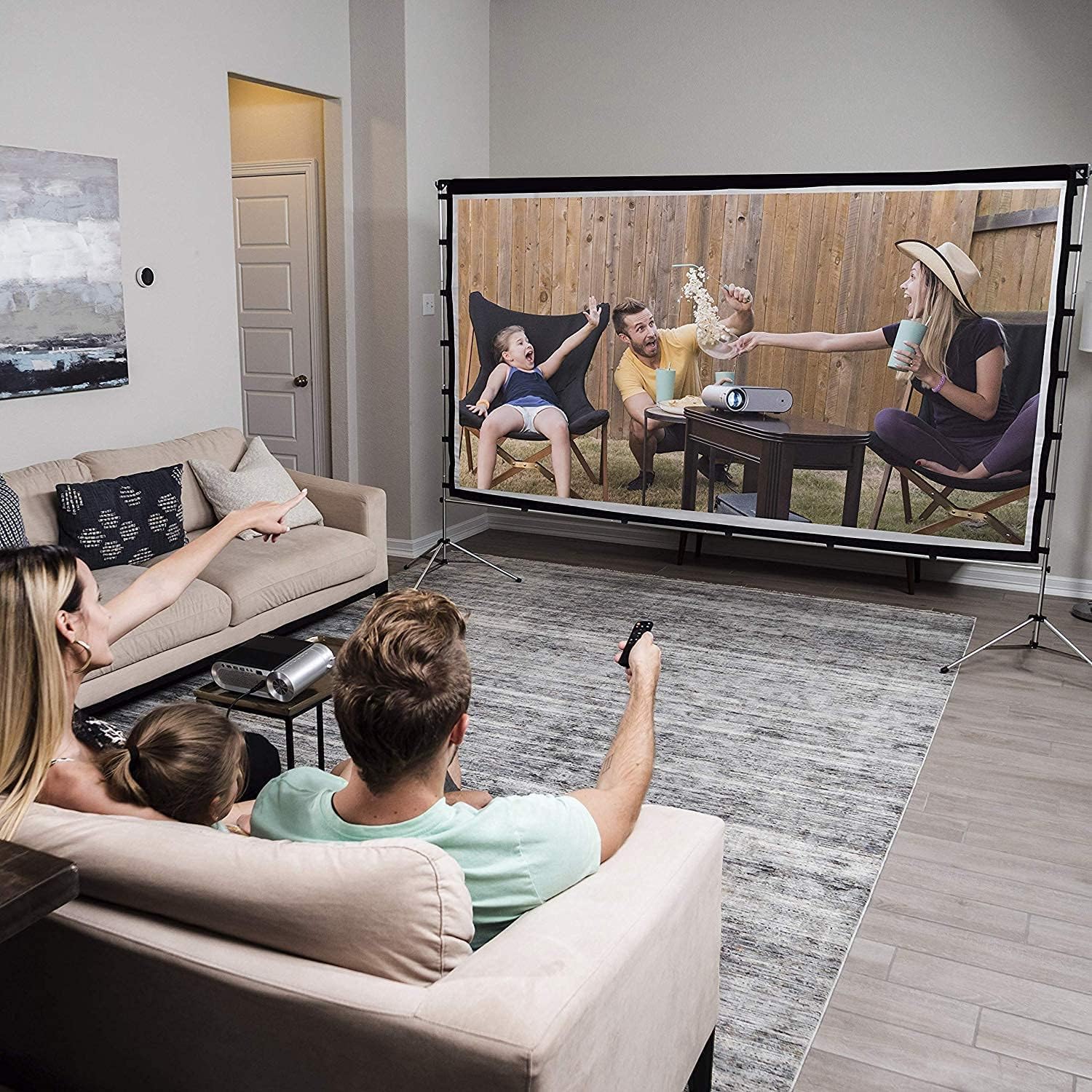 - [Easy to Carry]- The foldable 120" projector screen can be folded into 22*14 inches and fits compactly and securely into the Vamvo's matching carrying bag along with the projector stand and standβs accessories. The Vamvo movie projector screen with stand is perfect for outdoor, home theater, camping, etc. You only need one hand to lift the 6.95 pounds projection screen and carry it anywhere you want to go to start your movie journey.
