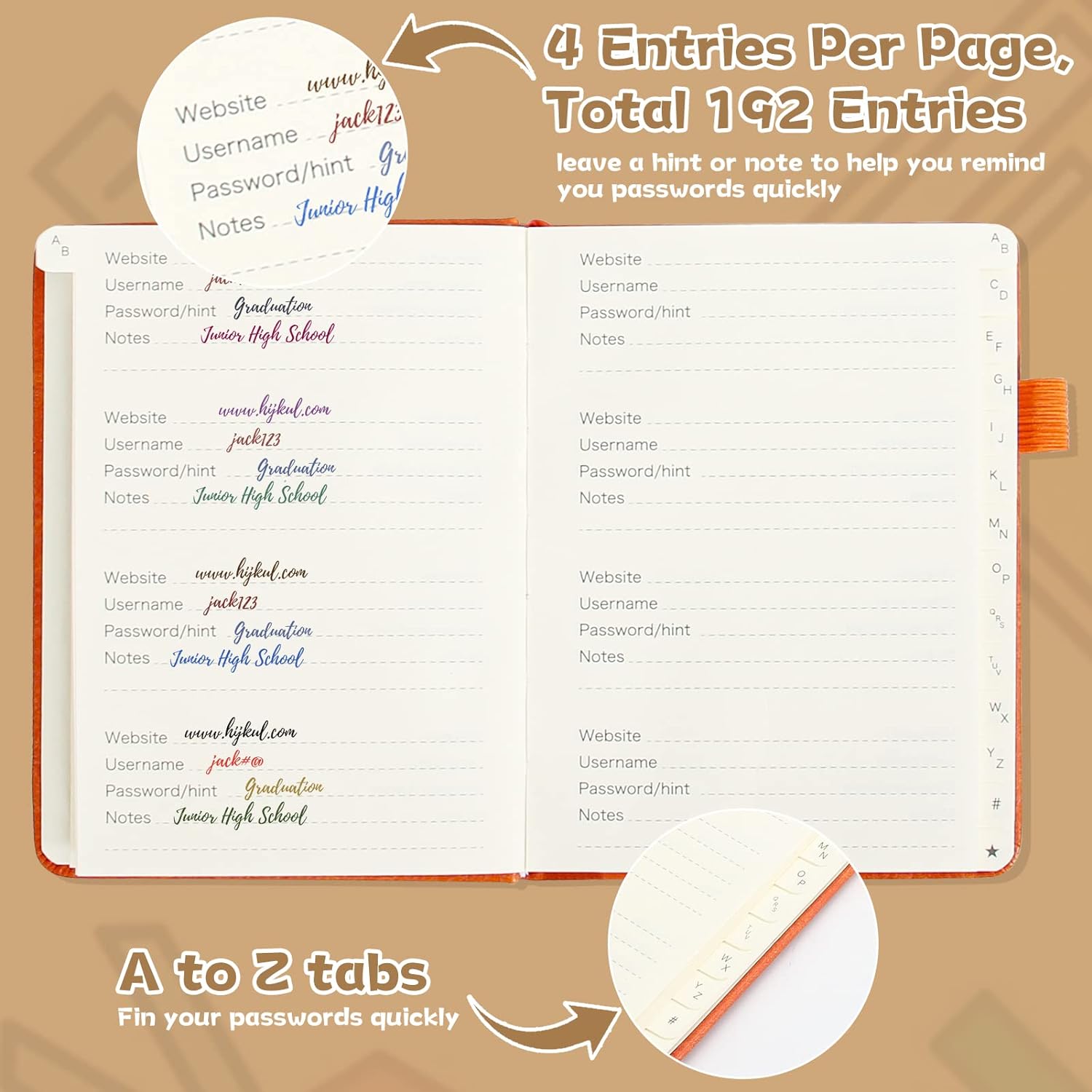- Convenient Content Design: Password book with A-Z alphabetical tab design you can store passwords alphabetically so that they can be found quickly. It has 4 entries per page, 192 entries in total for your records. In addition, there are 9 pages for records useful Internet and computer information and 4 pages for very important and most visited websites, and 19 blank pages for another content.