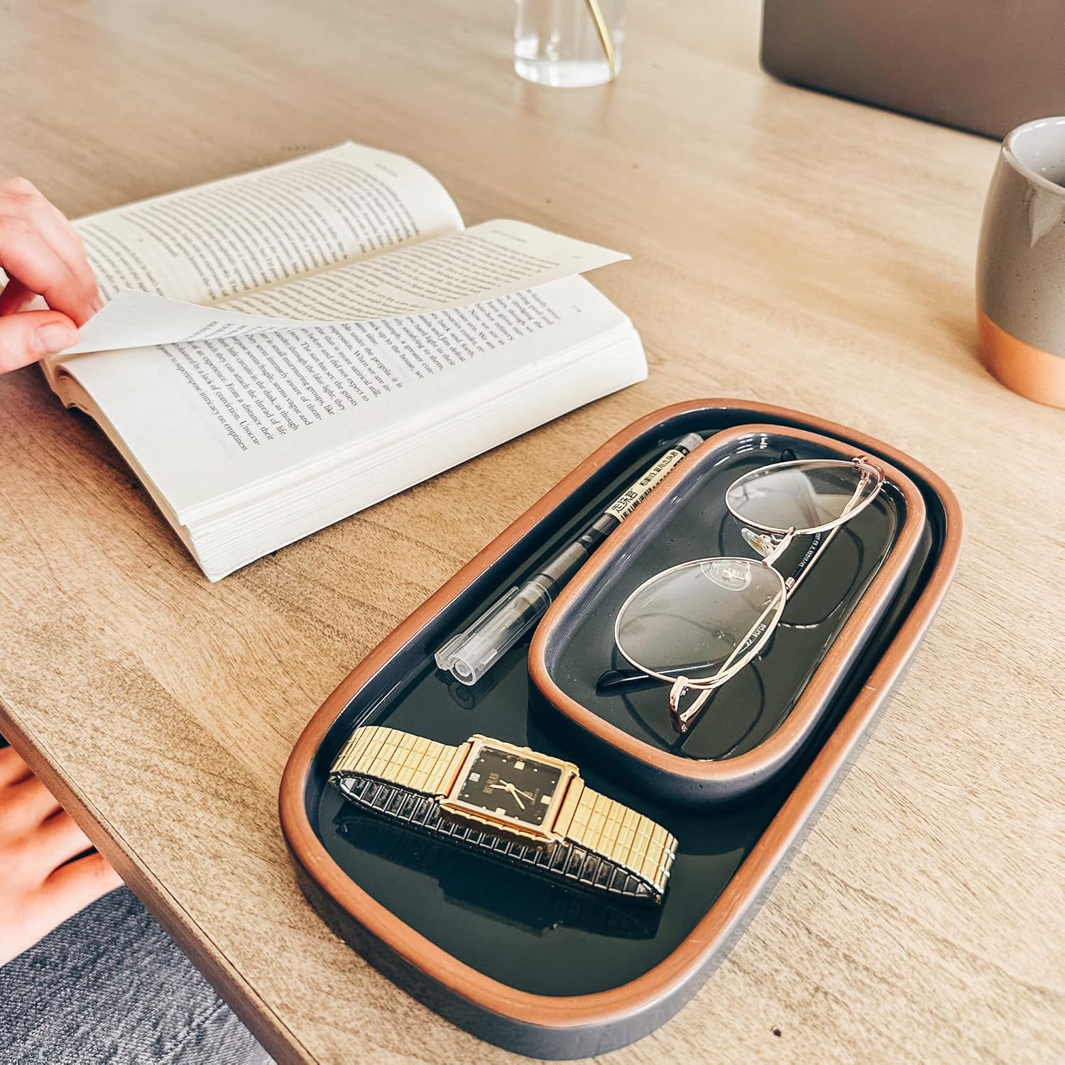 - VERSATILE USES: We all love a multi-functional object. Trays are all the rage right now and with good reason. Storing things on a tray gives a minimal and organized aesthetic and can be used for an endless amount of things. Your stationary, soap dispensers, brushes, candles, cosmetics, jewelry etc all deserve a beautiful home. The glaze is also food grade and work great for serving cheese, sushi, mini cakes, etc.