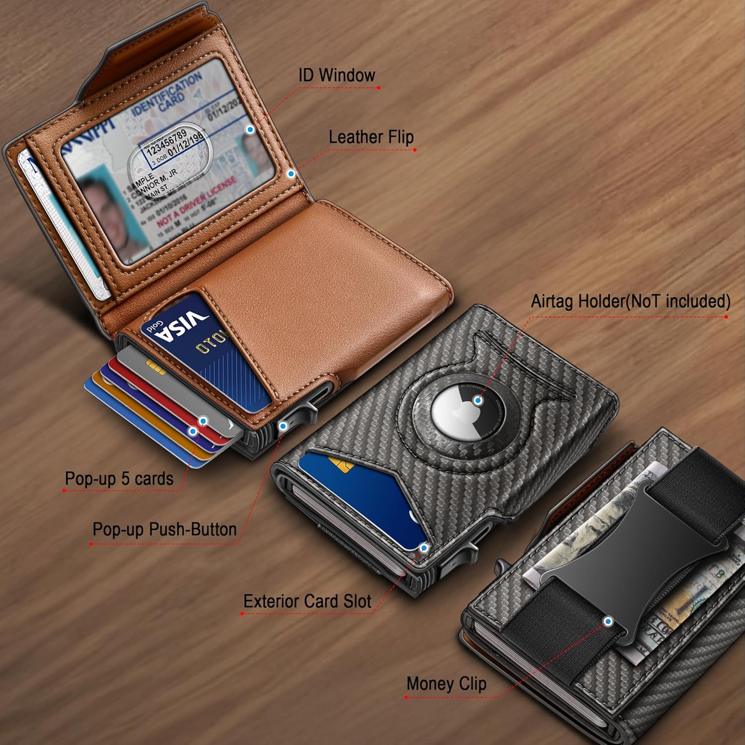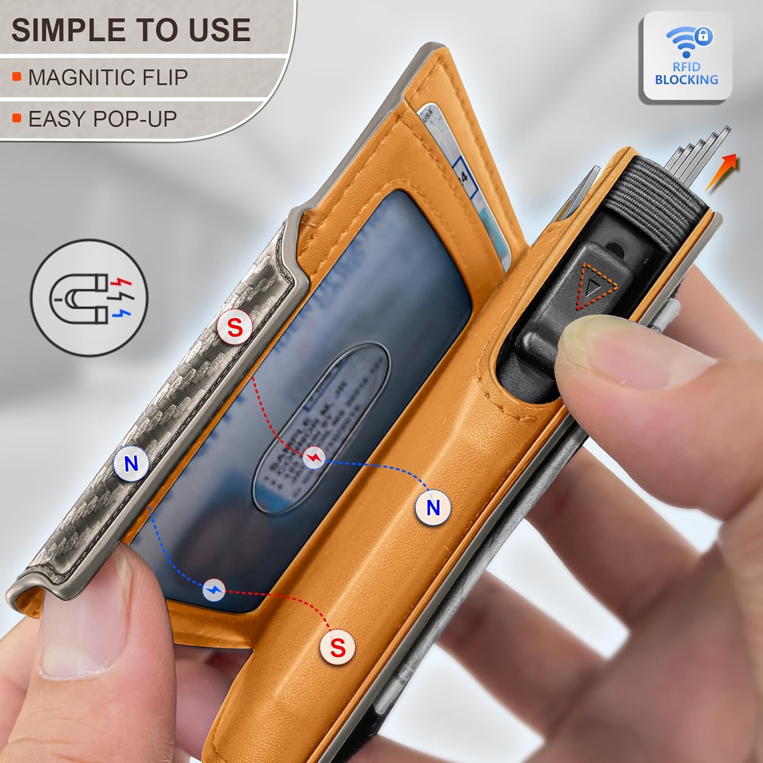 - CAPACITY-Slim wallet with refined layout to fit in front pocket,easy for 8 cards and couple of bills--5 cards in the aluminum case with pop-up access,3 cards in the leather shell;