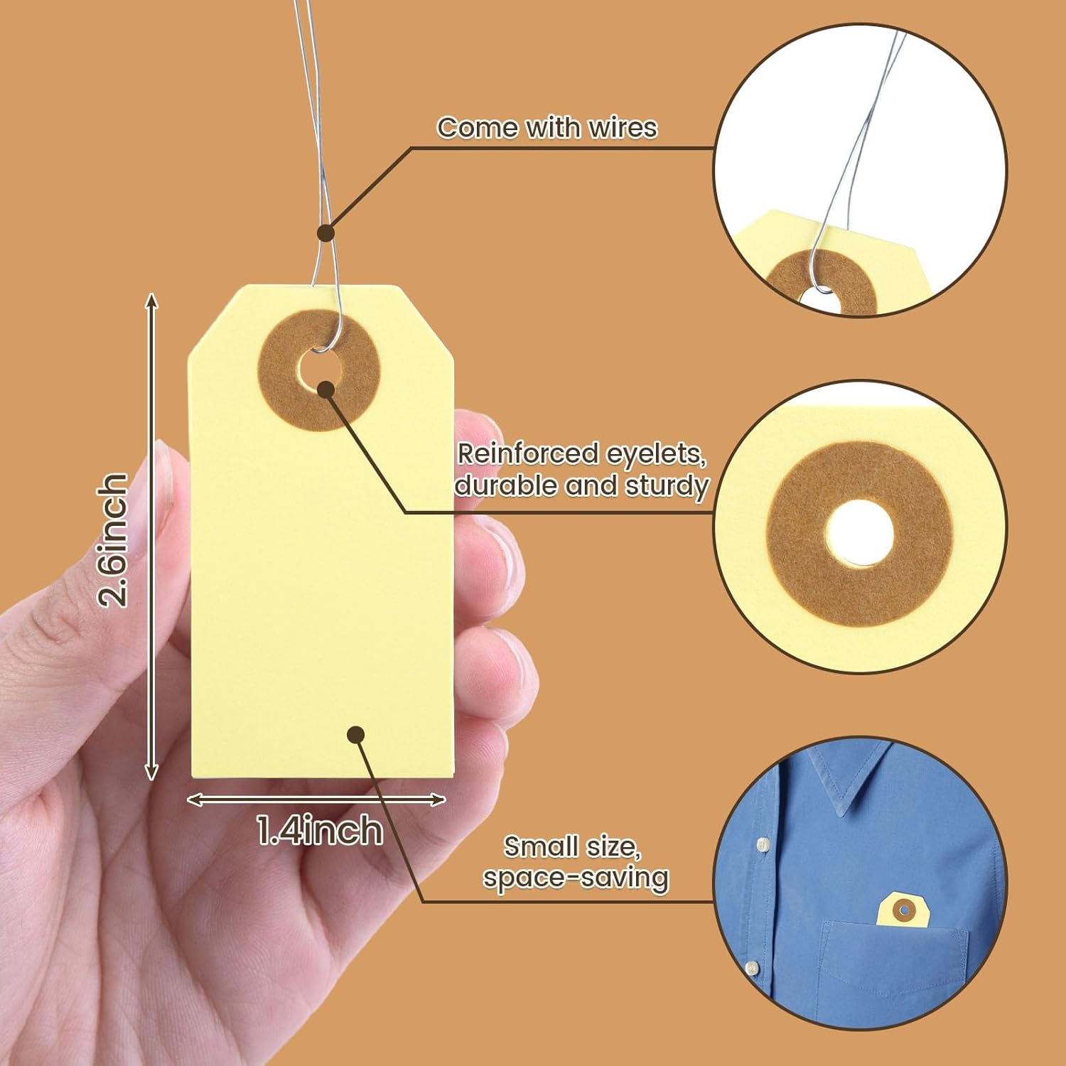 - Whatβs Included: 100PCS yellow small shipping tags and 100PCS metal wires, measuring 2.75"x1.37". These tags provide ample quantity for different purposes, improving organization and efficiency