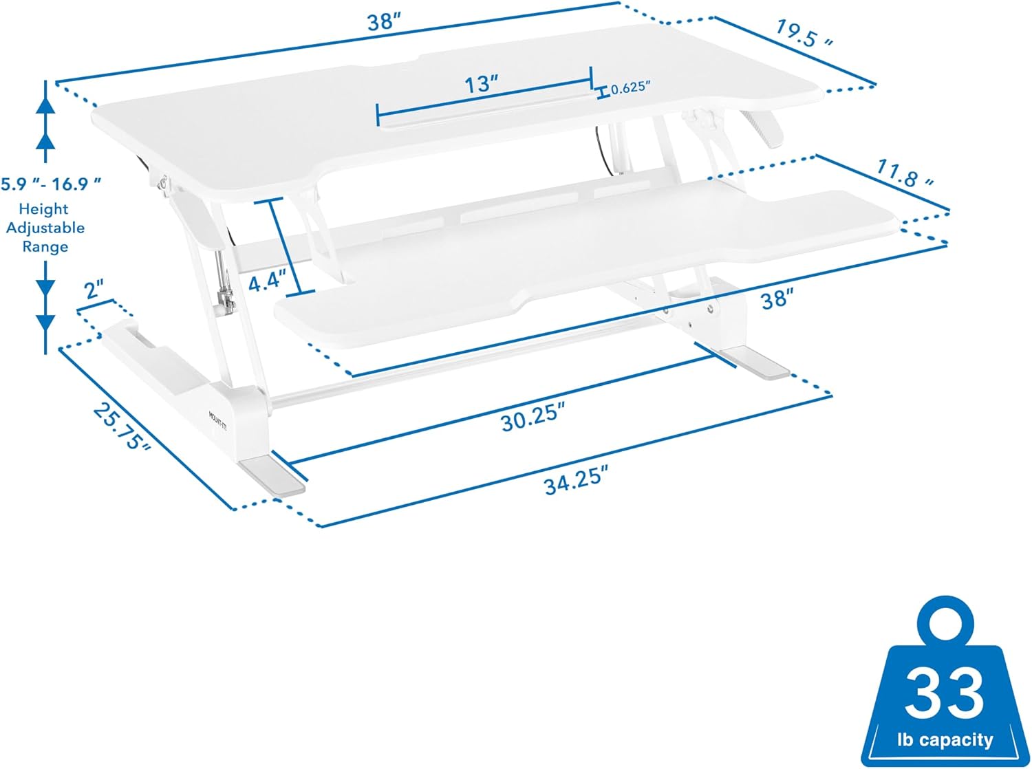 Mount-It! Standing Desk Converter White 38” Wide Height Adjustable Stand Up Desk Riser, Desk Topper with Gas Spring, Desktop Standing Desk with Keyboard Tray Fits Two Monitors