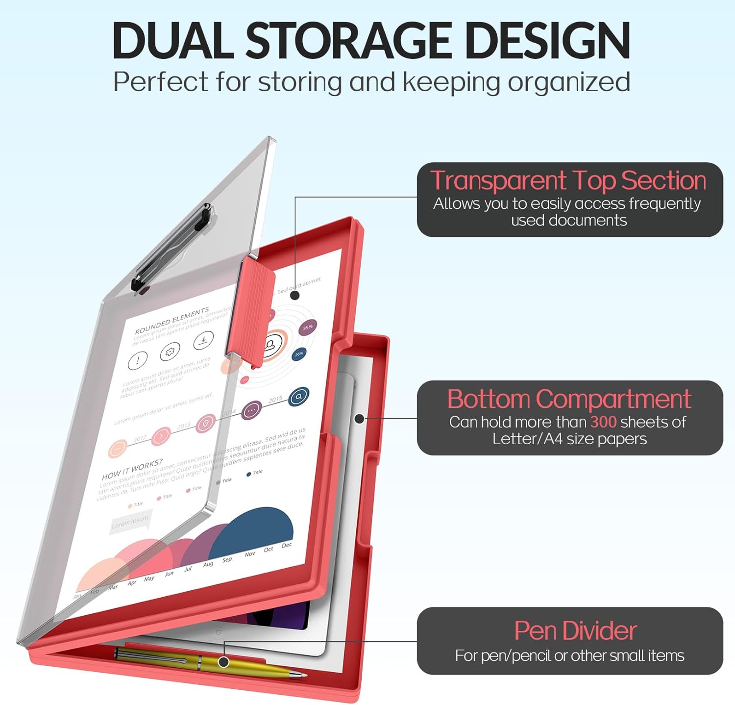 - Dual Storage Compartment: Dual-Layer design ensure roomy space for various needs of storage. Keep frequently used documents on the top compartment and store more than 300 letter-sized /A4 sheets in the spacious bottom compartment