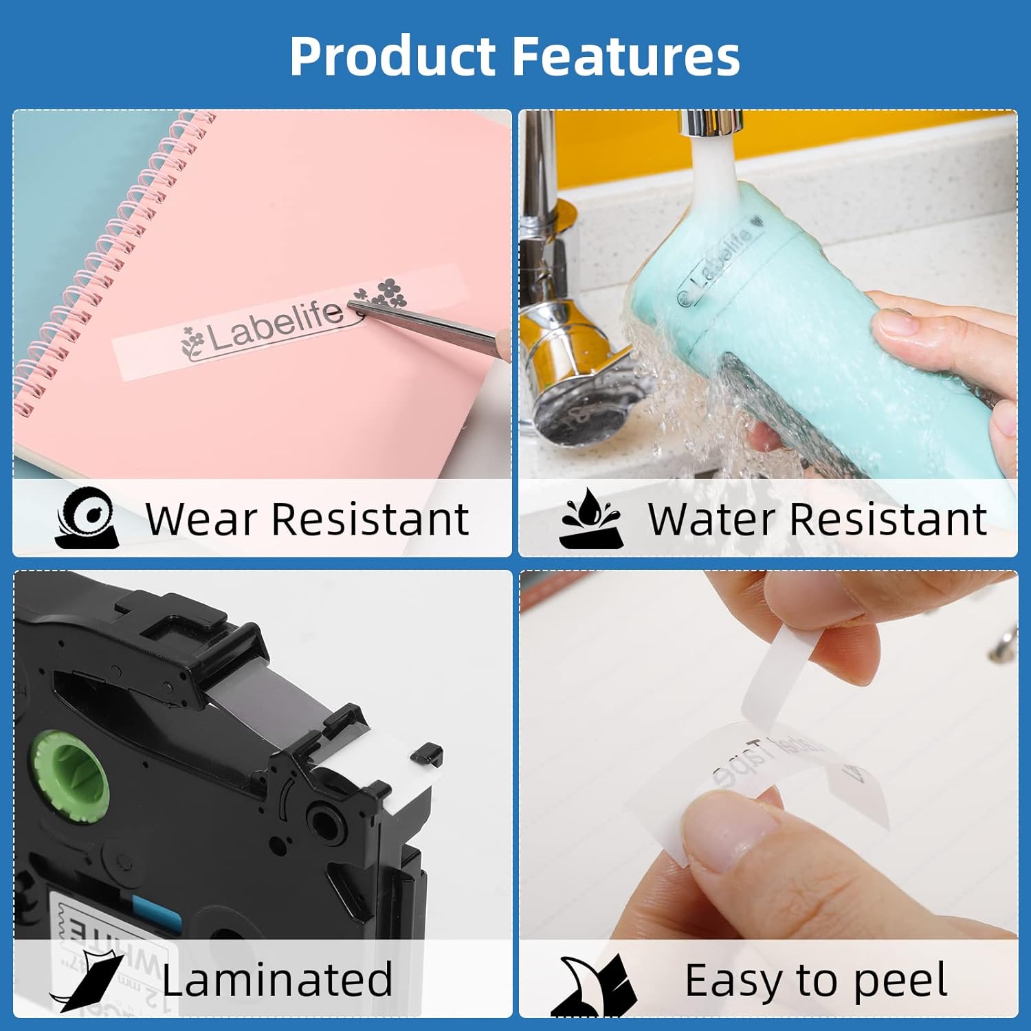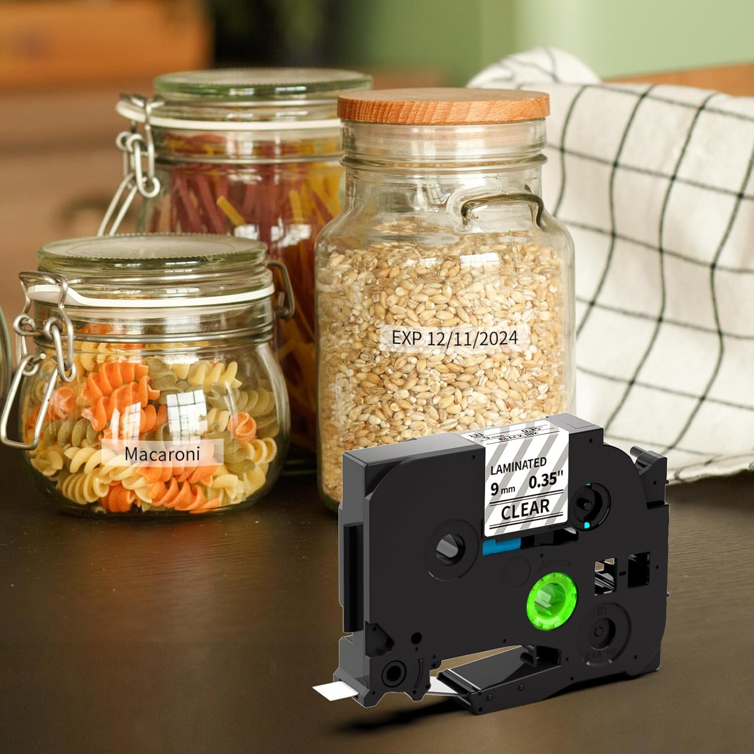 - Durability labels: Compatible with Brother p touch label maker 9mm clear tapes are laminated tape. It has features of withstand water/ oil/ abrasion/ temperature/ fade resistant, etc. Strong adhesive but zero sticky residue when removed. Split backing for easy peeling