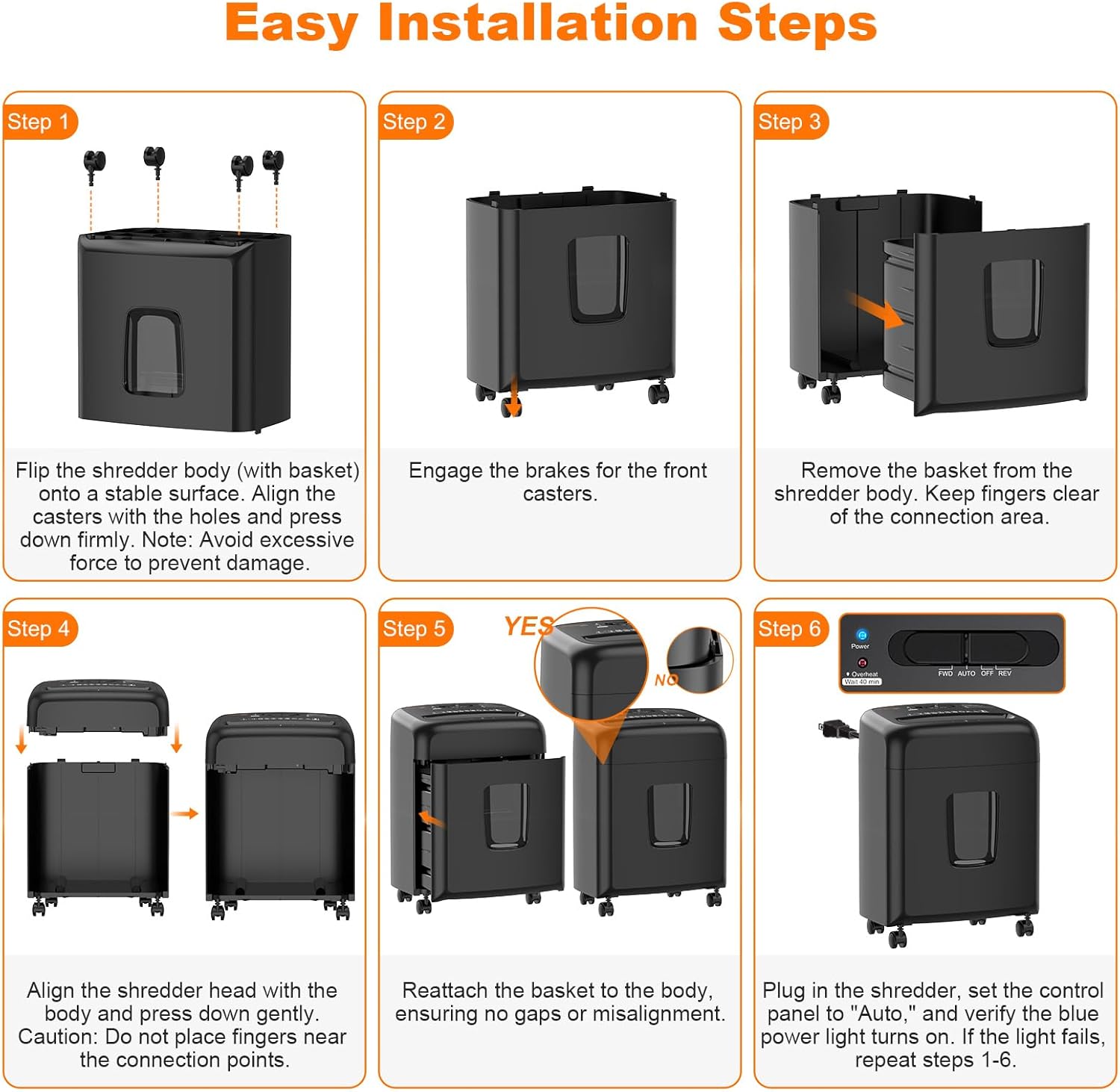 - Step 1: Flip the shredder body (with basket) onto a stable surface. Align the casters with the holes and press down firmly. Note: Avoid excessive force to prevent damage Step 2: Engage the brakes for the front casters Step 3: Remove the basket from the shredder body; Keep fingers clear of the connection area Step 4: Align the shredder head with the body and press down gently; Caution: Do not place fingers near the connection points Step 5: Reattach the basket to the body, ensuring no gaps or misalignment Step 6: Plug in the shredder, set the control panel to "Auto," and verify the blue power light turns on; If the light fails, repeat steps 1β6