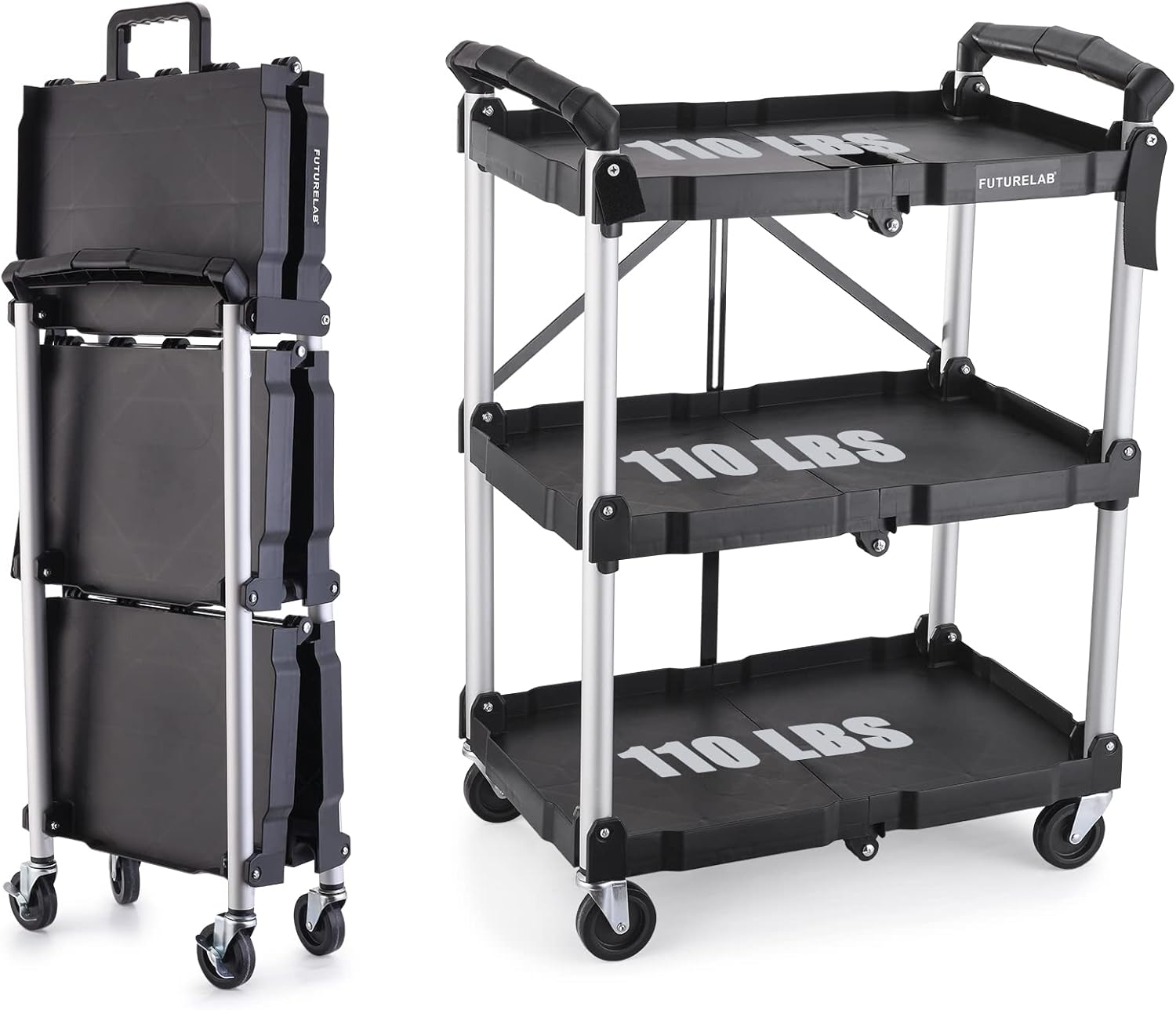 FUTURELAB Portable Folding Service Cart - 3 Tier 330LBS Capacity - Rolling Utility Foldable Cart with Wheels for Warehouse Home Workshops Garages Restaurants Offices