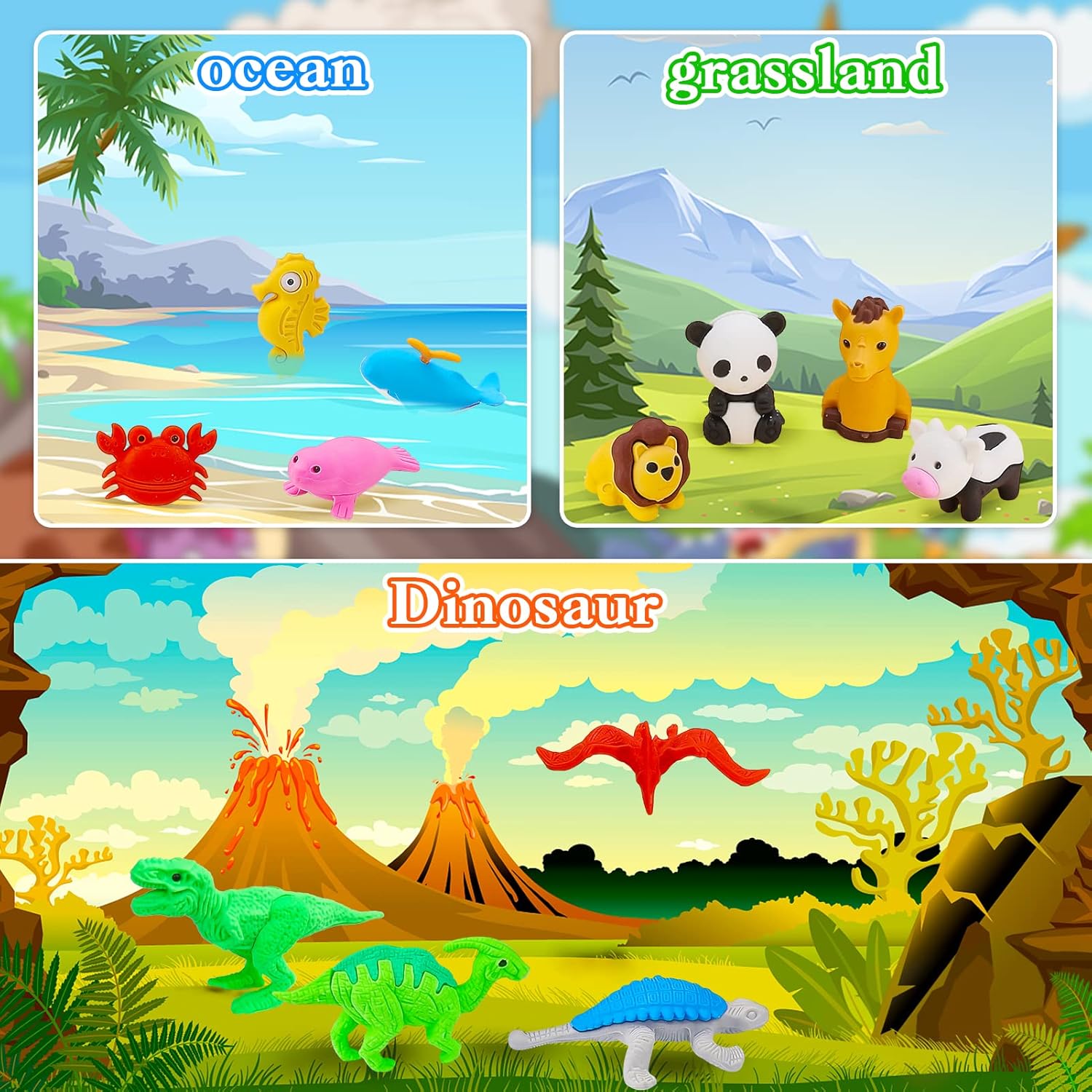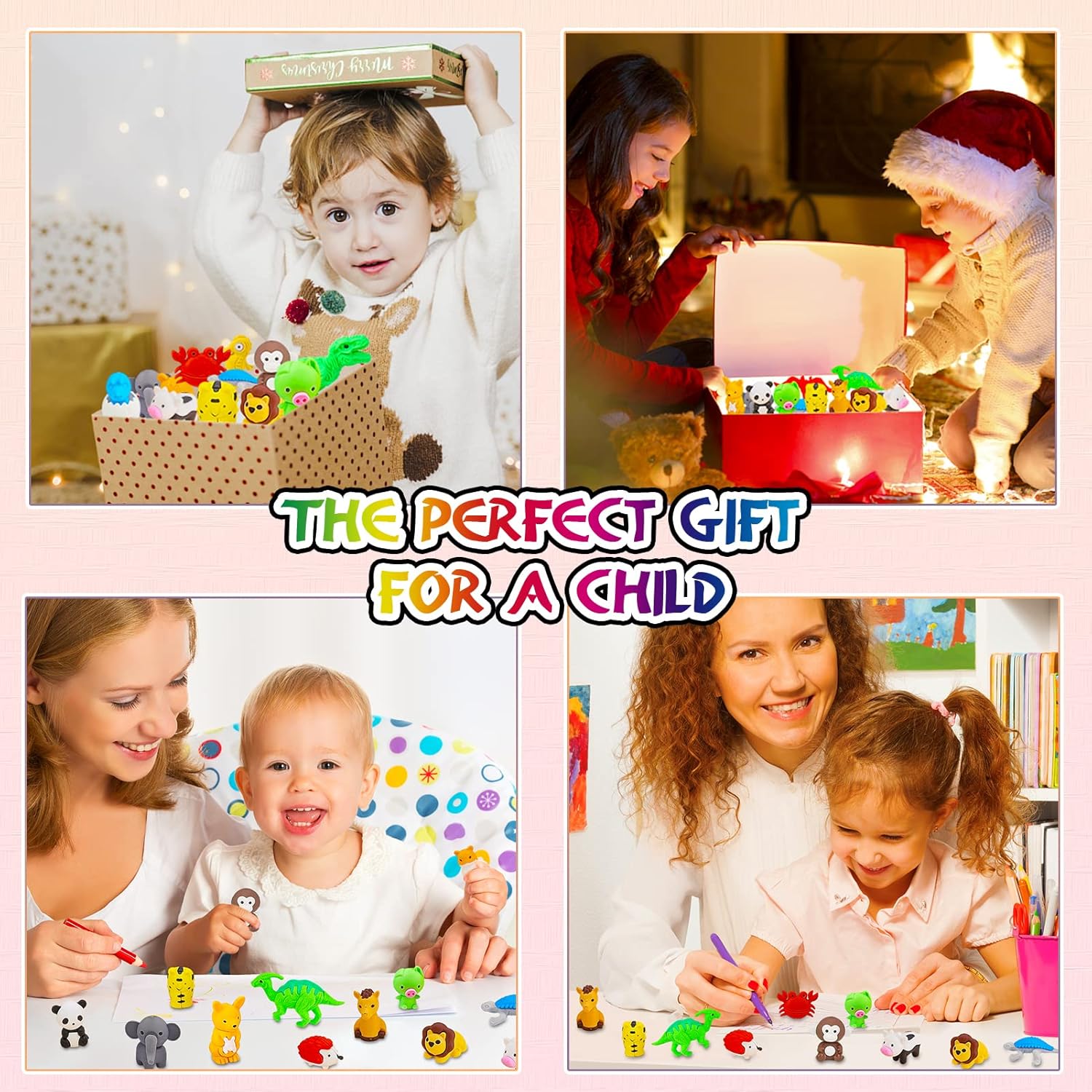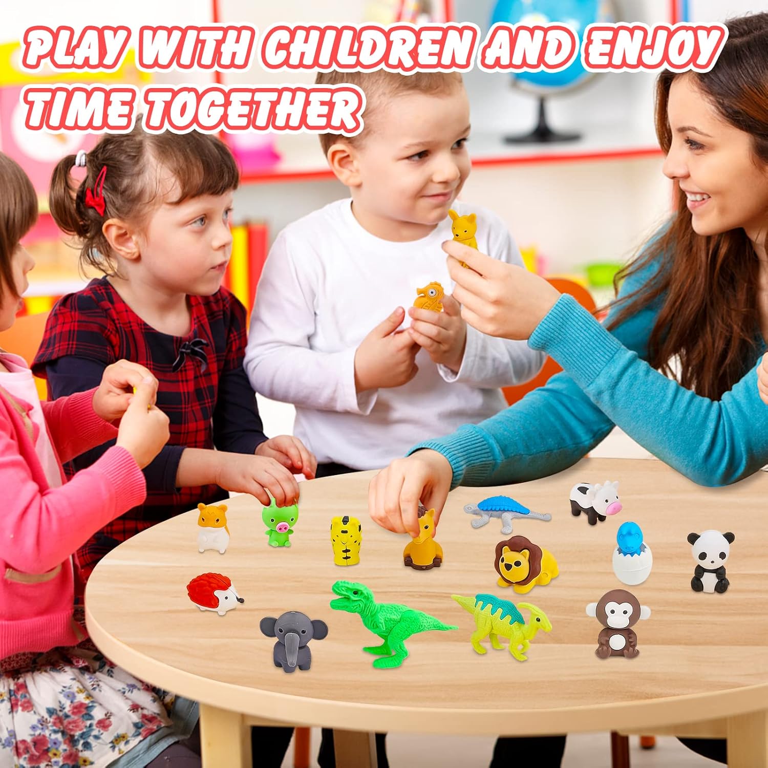 - FUNNY EDUCATIONAL TOY]: Kids animal pencil erasers with different shape and vibrant random colors, promote cognitive development. Through exchange erasers, kids can make new friends, bring peer's pleasure. Small toys improve hand-eye coordination, imagination and creativity. Good toys for little hands to sort, count, and play with.And it is safe for children over 3 years old
